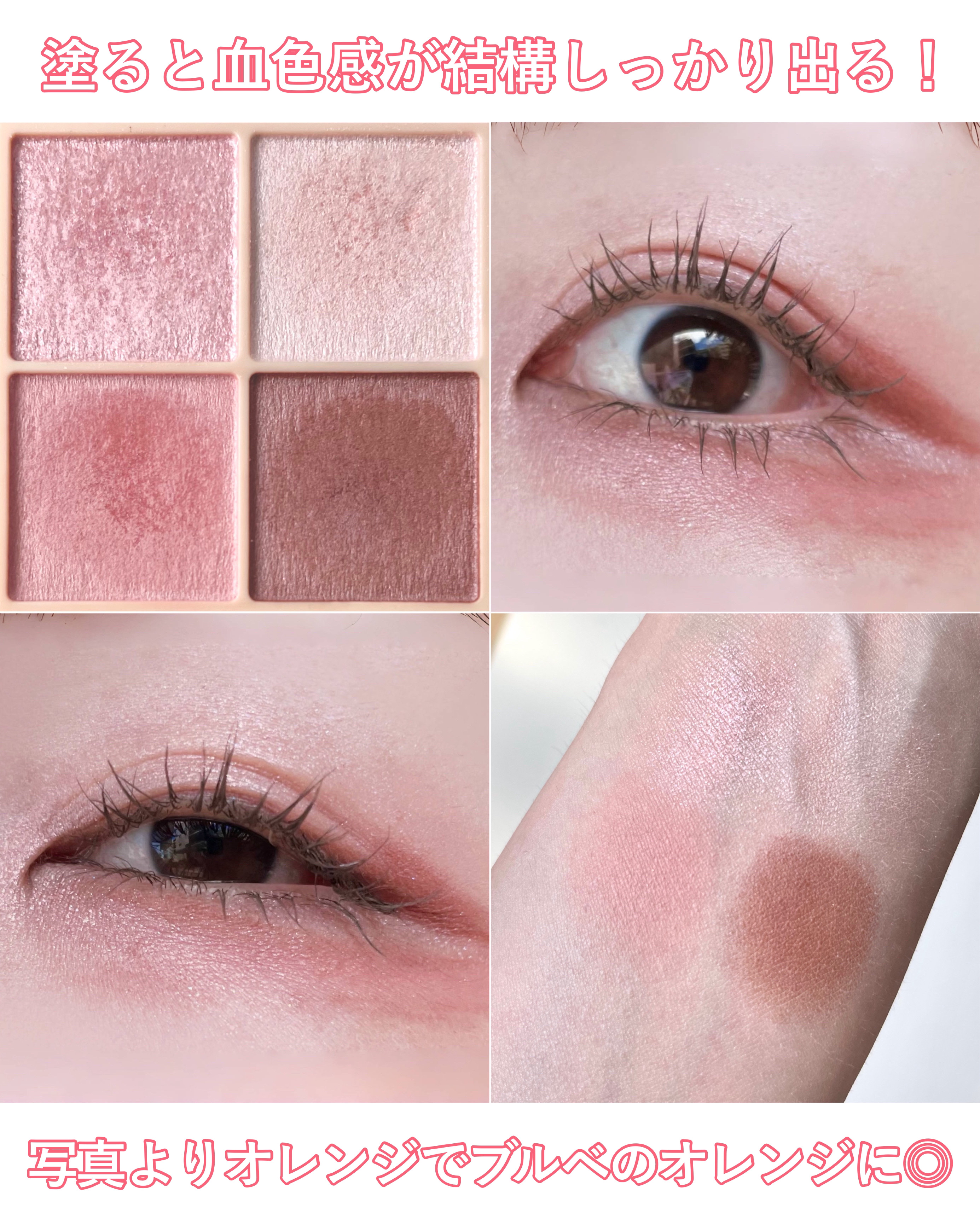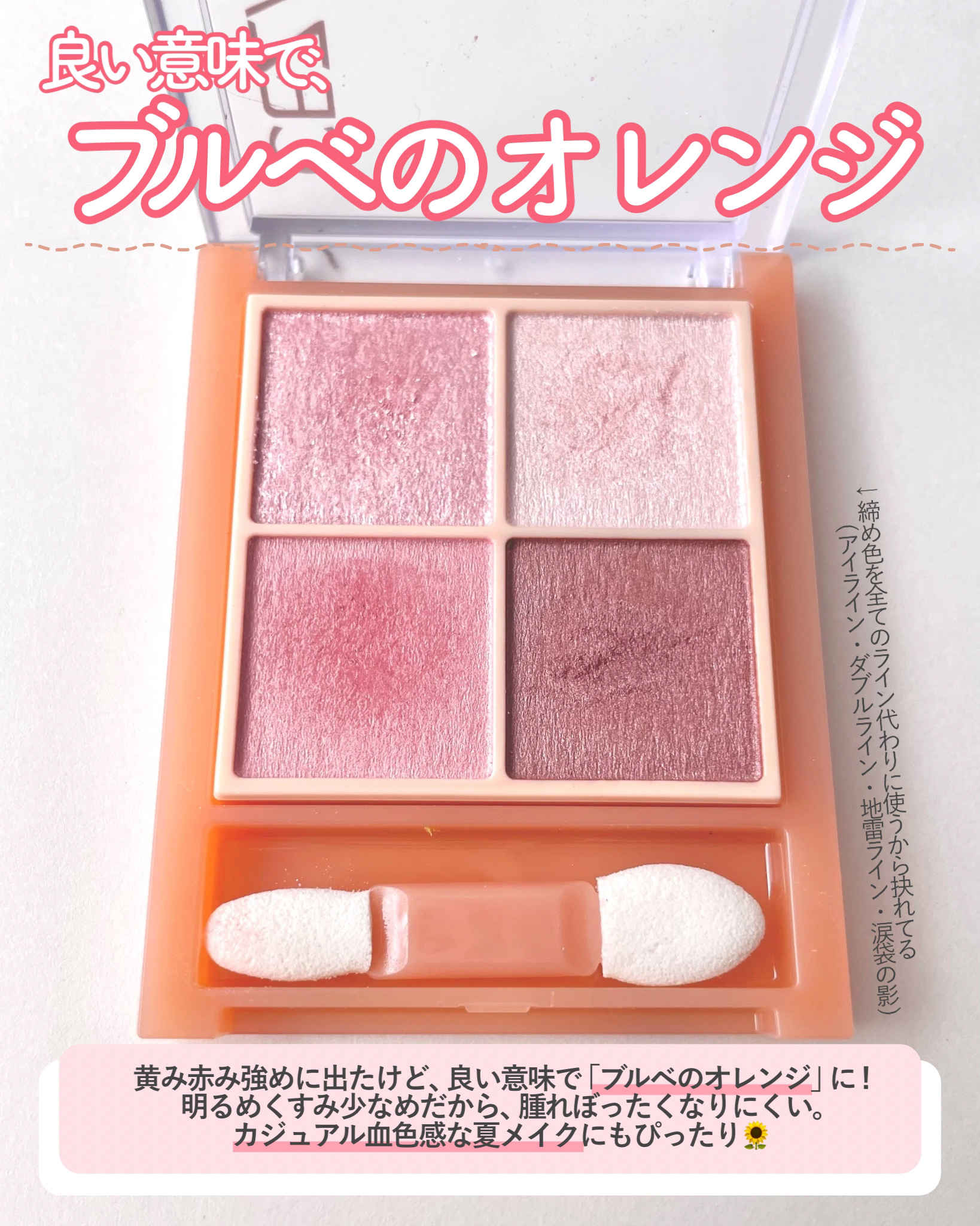 - ラメ・パール・マット3質感の4色アイシャドウ。 肌馴染みの良いベージュを基調としたカラー。ラメ・パール・マットの3質感を重ねて、自然にまぶたを強調し奥行のある大きな目元へ。 しっとり溶け込むような柔らかなパウダーなので、スルスル伸びてまぶたにピタッと密着。保湿成分(スクワラン・ホホバ種子油)配合。