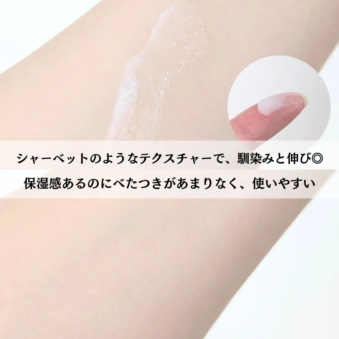| シャリッ・ふわっとしたちょっと特徴的な シャーベットのようなテクスチャ。たっぷり塗ってもベタつきにくい🙌 | 詳細を見る | ||