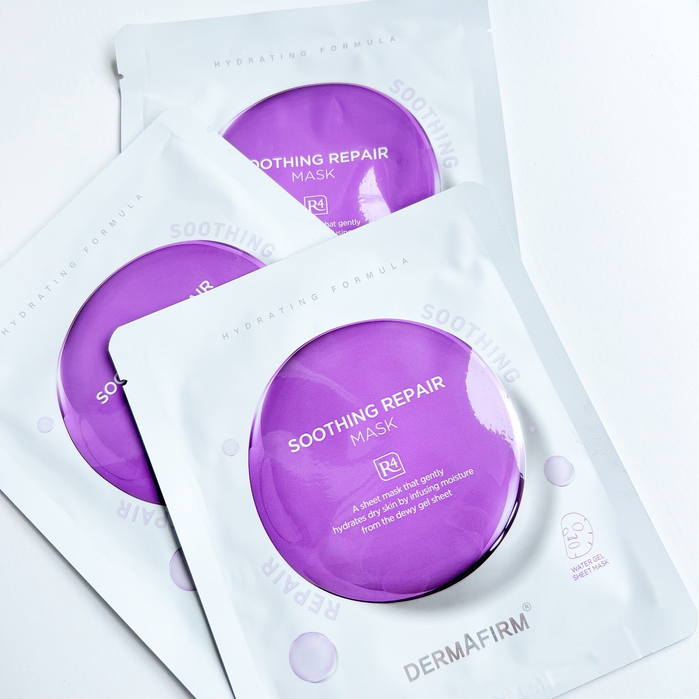 DERMAFIRM[R4]スージングマスクパック薄いプルプルした大き目のウォーターゲルシートで、たっぷり美容液がしみ込んでます!フィルムに乗った状態で入ってるから広げやすい🙆🏻アズレン成分が皮膚の潤いケア、リペプチドが肌荒れケア、更にエクソソ...