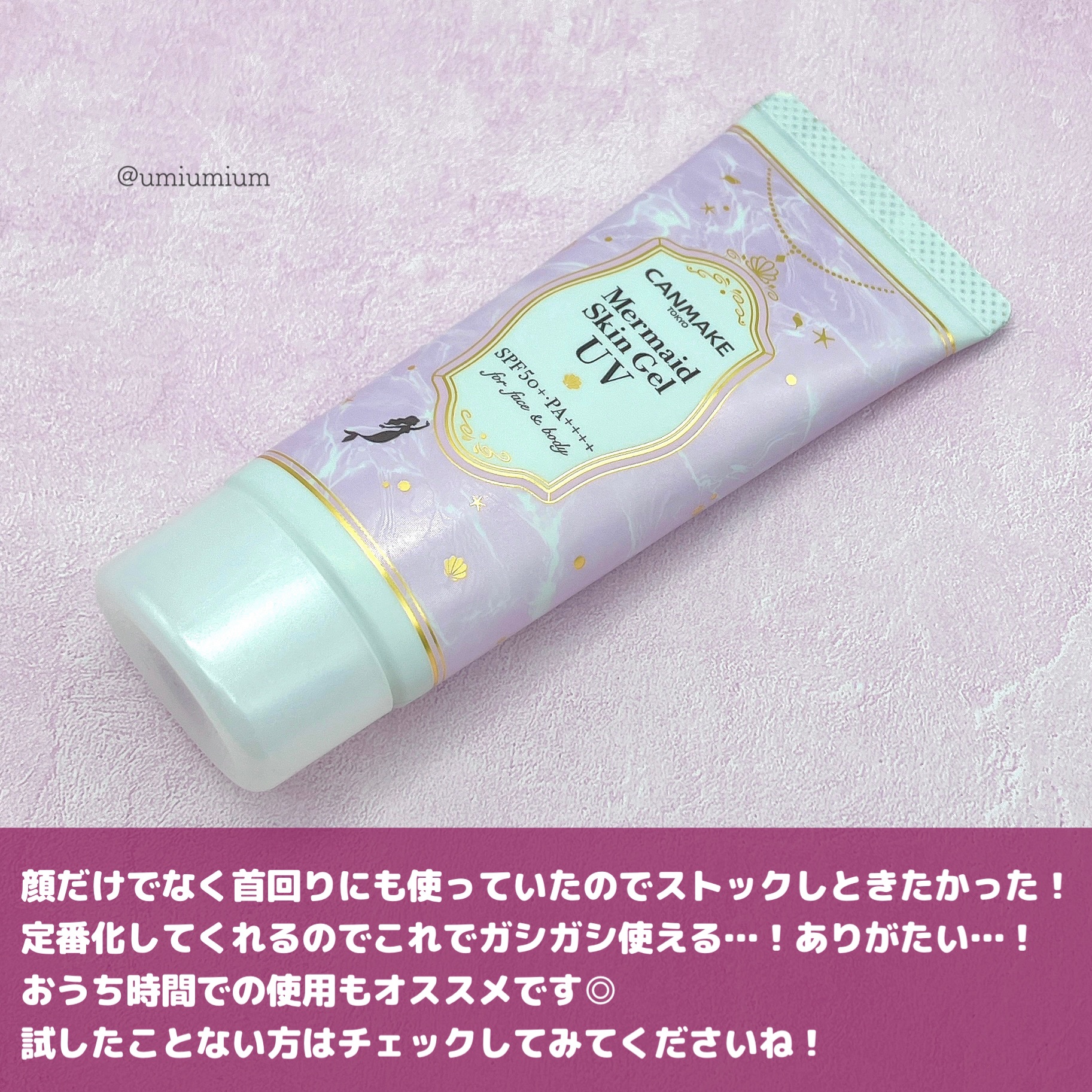 - パシャッと爽快!人魚姫気分♥化粧水感覚で使えるUVジェル 国内最強レベルのUVカット効果で紫外線から肌を守ります。 肌にのばすとパシャッとはじける水感ジェルでみずみずしく軽い仕上がり。 顔だけでなく全身にも使えます。 洗顔後、これ1本でスキンケア・保湿下地・UVカット下地としてご使用いただけます。 ※2~3時間ごとにこまめに塗り直しをしてください。 また、肌をタオル等で拭いた際も塗り直しを推奨いたします。