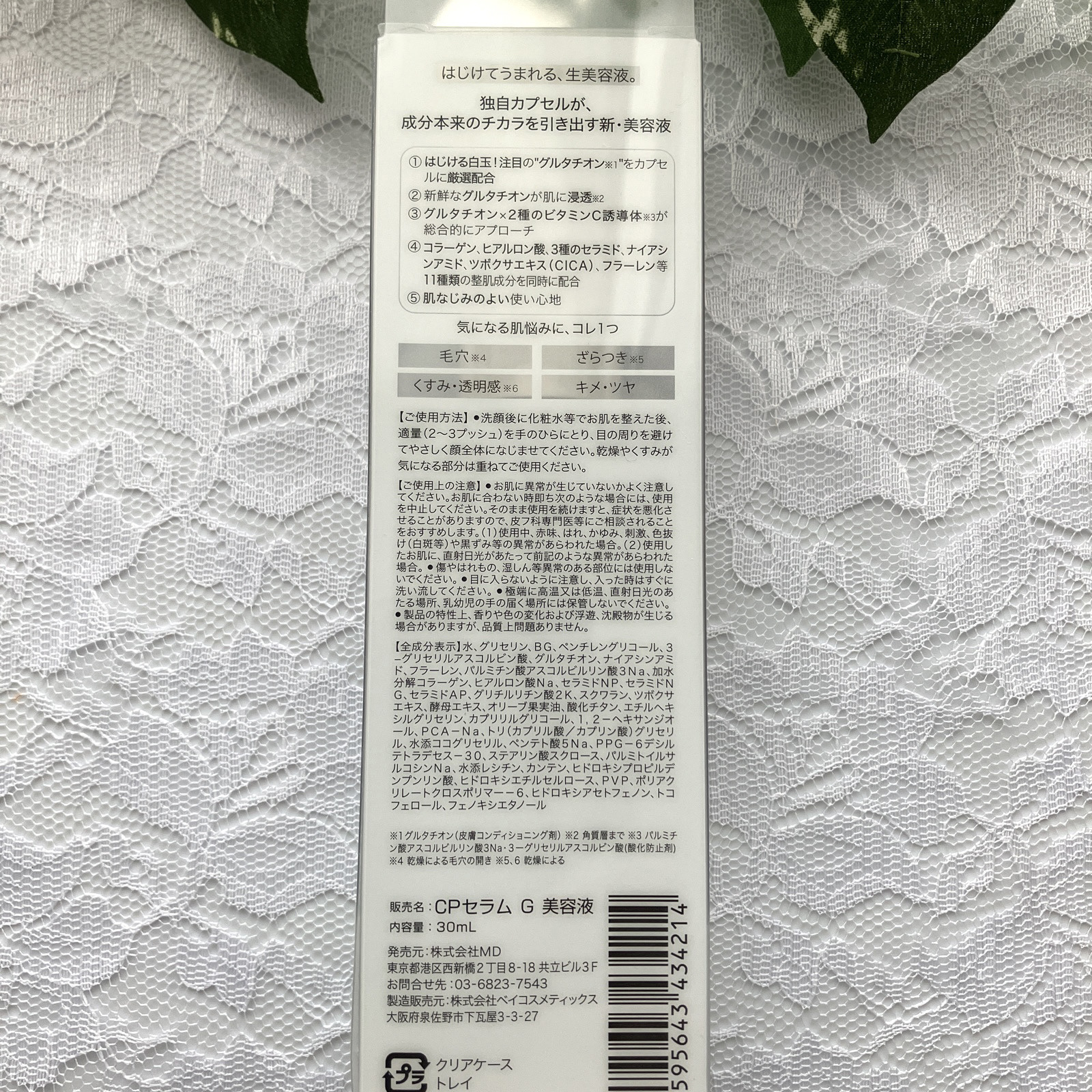 - <30ml> 水、グリセリン、BG、ペンチレングリコール、3−グリセリルアスコルビン酸、グルタチオン、ナイアシンアミド、フラーレン、パルミチン酸アスコルビルリン酸3Na、加水分解コラーゲン、ヒアルロン酸Na、セラミドNP、セラミドNG、セラミドAP、グリチルリチン酸2K、スクワラン、ツボクサエキス、酵母エキス、オリーブ果実油、酸化チタン、エチルヘキシルグリセリン、カプリリルグリコール、1,2-ヘキサンジオール、PCA-Na、トリ(カプリル酸/カプリン酸)グリセリル、水添ココグリセリル、ペンテト酸5Na、PPG-6デシルテトラデセス-30、ステアリン酸スクロース、パルミトイルサルコシンNa、水添レシチン、カンテン、ヒドロキシプロピルデンプンリン酸、ヒドロキシエチルセルロース、PVP、ポリアクリレートクロスポリマー-6、ヒドロキシアセトフェノン、トコフェロール、フェノキシエタノール
