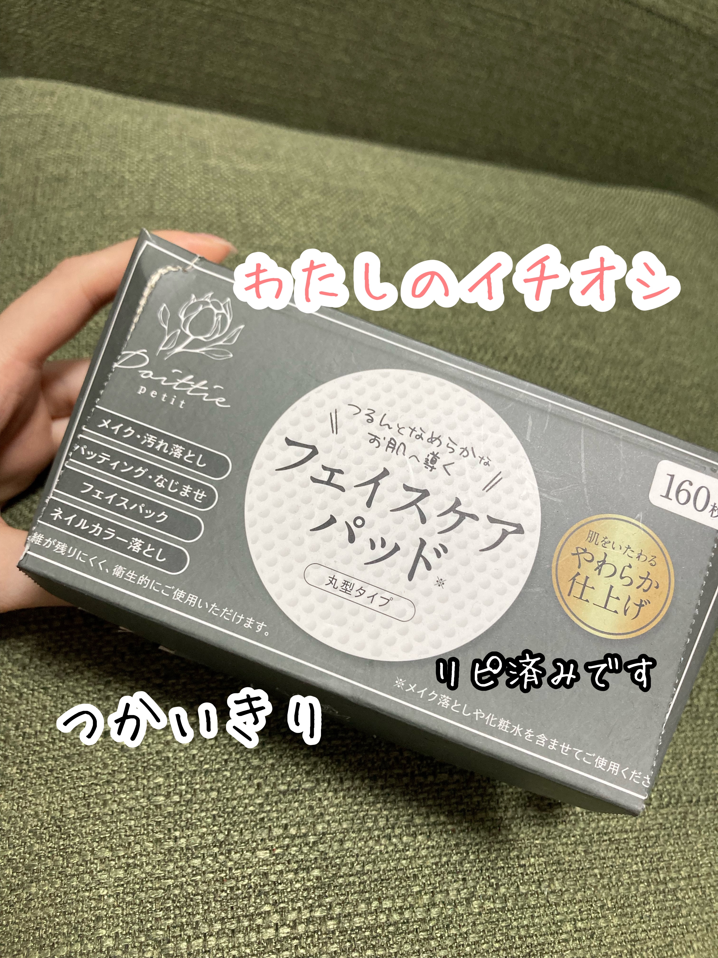 拭き取りパッドみたいな凸凹面と滑らかな面のパッド☺️ 厚みはあまりないので、化粧水を含ませて拭き取りしたりメイクアップリムーバーをつけてメイクを落としたりと使い方はたくさん✨ コットンよりも化粧水が少なくてもヒタヒタになるのでコスパよく使え、大きさもあるので頬など広めにパック出来ます。 ネイル💅オフもラメなど凸凹面で取れそうなのでマニキュアのオフにも良さそうです☺️
