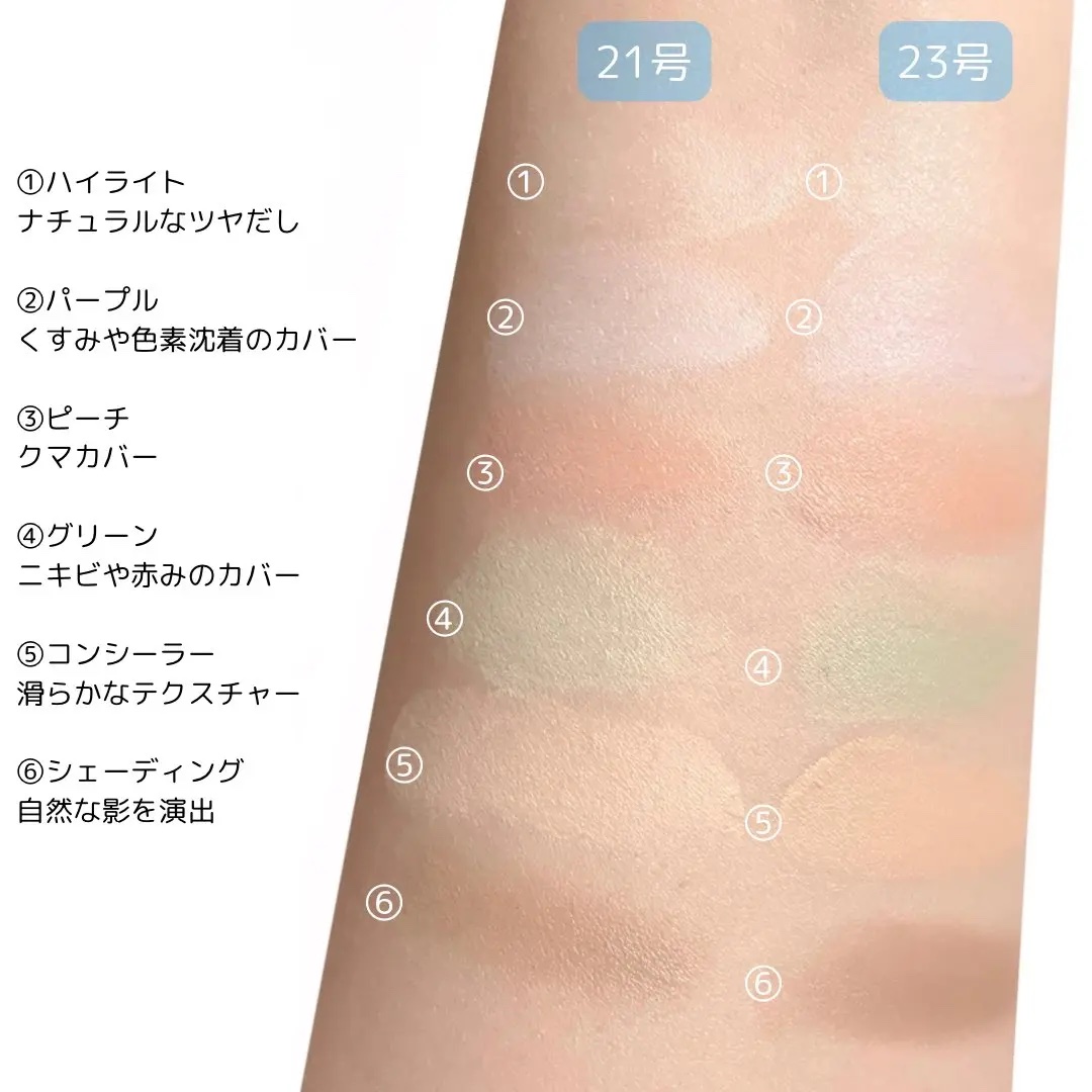 - 6色のカラーが入った、コンシーラーパレットで、コンシーラーとしてだけでなく、シェーディング、ハイライト、トーン調整が可能です。 ピーチ: クマカバーにおすすめ。保湿力が高く、ナチュラルなツヤ感です。 グリーン:ニキビや赤みのカバーにおすすめ。滑らかなテクスチャーで、カバー力が高いです。 パープル: くすみカバーにおすすめ。保湿力が高く、ナチュラルなツヤ感です。 ハイライト: 光の屈折を利用し、自然で柔らかい輝きを与えます。 シェーディング: 自然に影を演出し、しっかりと密着します。 コンシーラー: 滑らかなテクスチャーで、カバー力が高いです。