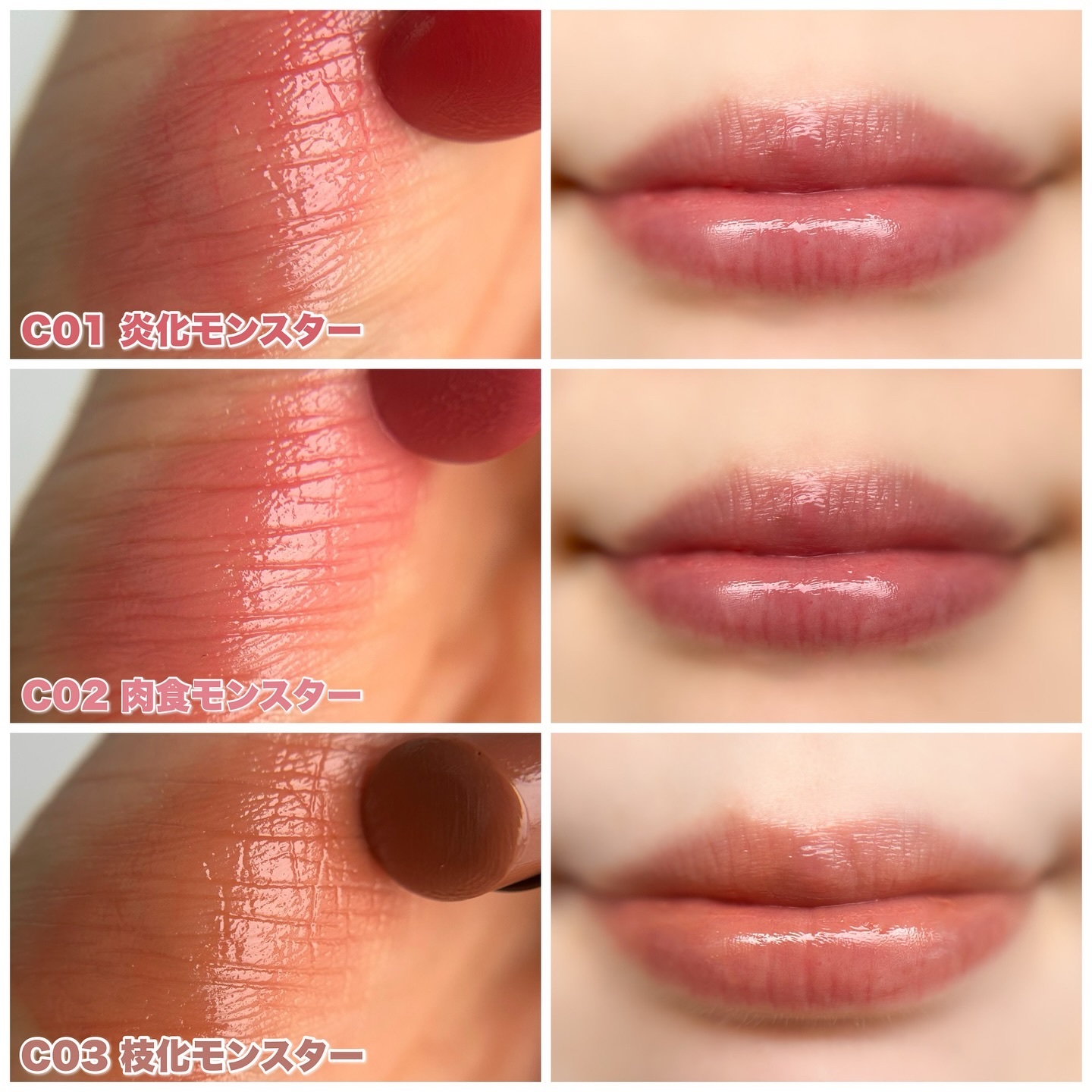 - <C01 炎化モンスター> テトライソステアリン酸ジペンタエリスリチル、オクチルドデカノール、トリ(カプリル酸/カプリン酸)グリセリル、イソノナン酸イソトリデシル、ラウロイルグルタミン酸ジ(フィトステリル/オクチルドデシル)、ビスアルキル(C16-18)グリセリルウンデシルジメチコン、パラフィン、水添ポリイソブテン、合成ワックス、ダイマージリノール酸(フィトステリル/イソステアリル/セチル/ステアリル/ベヘニル)、ラウロイルグルタミン酸ジ(オクチルドデシル/フィトステリル/ベヘニル)、マイクロクリスタリンワックス、水添マイクロクリスタリンワックス、トコフェロール、ホホバ種子油、オリーブ果実油、アーモンド油、ヒドロキシステアリン酸エチルヘキシル、(エチレン/プロピレン)コポリマー、ポリエチレン、(+/-)(チタン/酸化チタン)焼結物、マイカ、ラウロイルアスパラギン酸Na、ラウロイルリシン、塩化亜鉛、酸化鉄、硫酸Ba、トリイソステアリン酸イソプロピルチタン、赤202 <C02 肉色モンスター> テトライソステアリン酸ジペンタエリスリチル、オクチルドデカノール、トリ(カプリル酸/カプリン酸)グリセリル、イソノナン酸イソトリデシル、ラウロイルグルタミン酸ジ(フィトステリル/オクチルドデシル)、ビスアルキル(C16-18)グリセリルウンデシルジメチコン、パラフィン、水添ポリイソブテン、合成ワックス、ダイマージリノール酸(フィトステリル/イソステアリル/セチル/ステアリル/ベヘニル)、ラウロイルグルタミン酸ジ(オクチルドデシル/フィトステリル/ベヘニル)、マイクロクリスタリンワックス、水添マイクロクリスタリンワックス、トコフェロール、ホホバ種子油、オリーブ果実油、アーモンド油、ヒドロキシステアリン酸エチルヘキシル、(エチレン/プロピレン)コポリマー、ポリエチレン、ジメチコン、(+/-)(チタン/酸化チタン)焼結物、マイカ、ラウロイルアスパラギン酸Na、ラウロイルリシン、塩化亜鉛、酸化チタン、酸化鉄、水酸化Al、硫酸Ba、トリイソステアリン酸イソプロピルチタン、赤202 <C03 枝化モンスター> テトライソステアリン酸ジペンタエリスリチル、オクチルドデカノール、トリ(カプリル酸/カプリン酸)グリセリル、イソノナン酸イソトリデシル、ラウロイルグルタミン酸ジ(フィトステリル/オクチルドデシル)、ビスアルキル(C16-18)グリセリルウンデシルジメチコン、パラフィン、水添ポリイソブテン、合成ワックス、ダイマージリノール酸(フィトステリル/イソステアリル/セチル/ステアリル/ベヘニル)、ラウロイルグルタミン酸ジ(オクチルドデシル/フィトステリル/ベヘニル)、マイクロクリスタリンワックス、水添マイクロクリスタリンワックス、トコフェロール、ホホバ種子油、オリーブ果実油、アーモンド油、ヒドロキシステアリン酸エチルヘキシル、(エチレン/プロピレン)コポリマー、ポリエチレン、ジメチコン、(+/-)(チタン/酸化チタン)焼結物、マイカ、ラウロイルアスパラギン酸Na、ラウロイルリシン、塩化亜鉛、酸化チタン、酸化鉄、水酸化Al、硫酸Ba、トリイソステアリン酸イソプロピルチタン、赤202