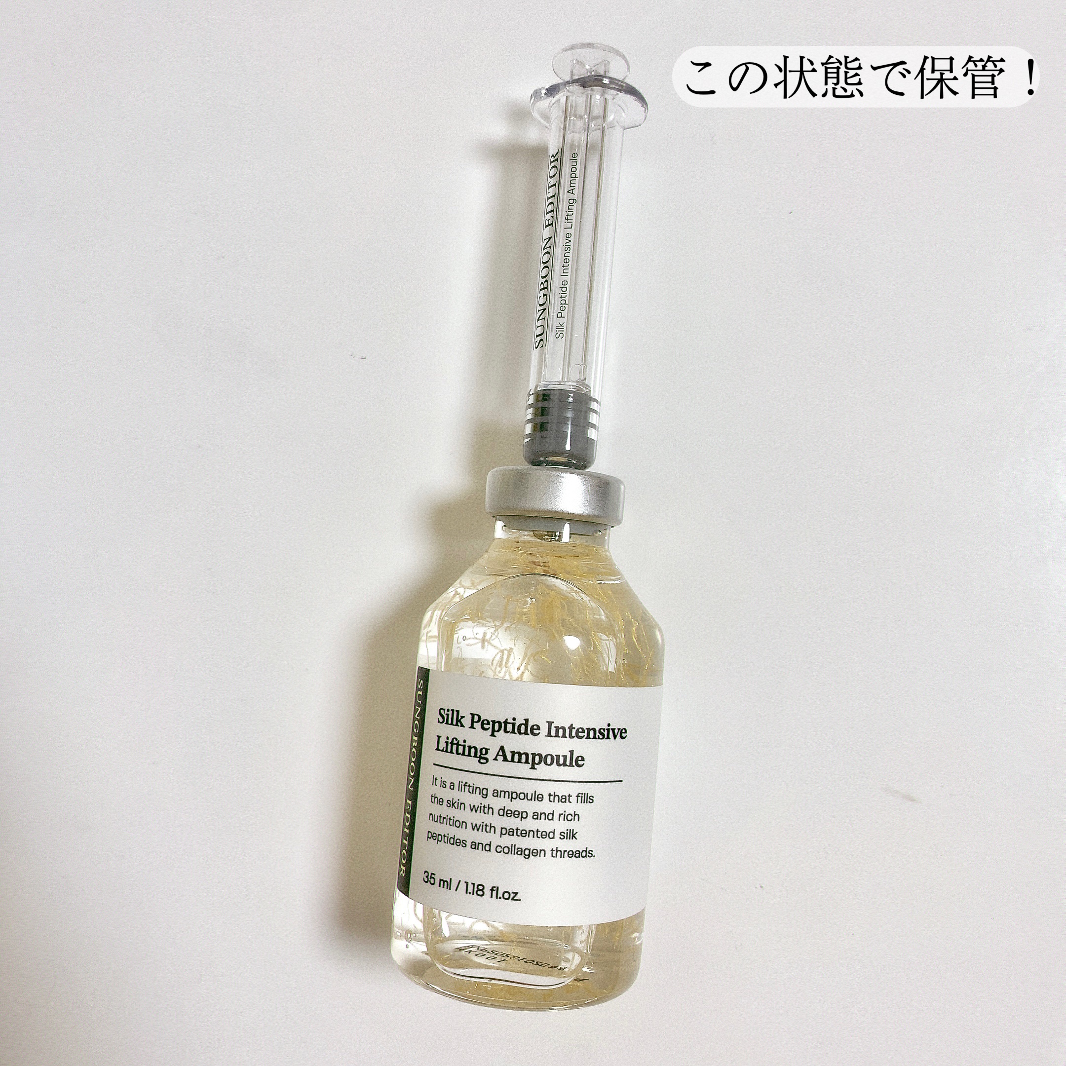 金色の糸が入った美容液なんて初めて見たSUNGBOONEDITOR成分エディターシルクペプチドインテンシブリフティングアンプル35ml注射器で吸い上げて使う珍しい形の美容液です。金色のコラーゲン糸が入っていて、潤いとハリが供給されるんだとか。...
