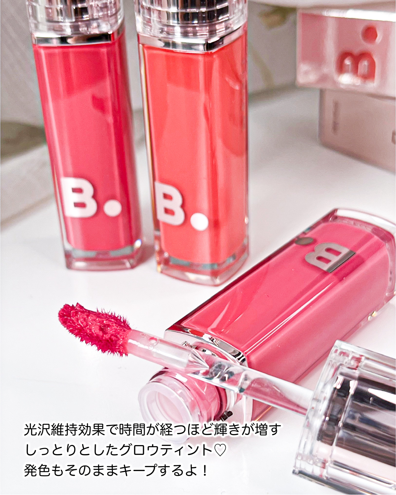 ぷるんとした光沢感でぼってりとしたオーバーリップに ❤︎ グロスオイルティントでツヤ感が綺麗𖤐˒˒ まるで風船のような、ふっくらした光沢感に。 珍しいブラシタイプのアプリケーターでこれ、めちゃくちゃ塗りやすい!