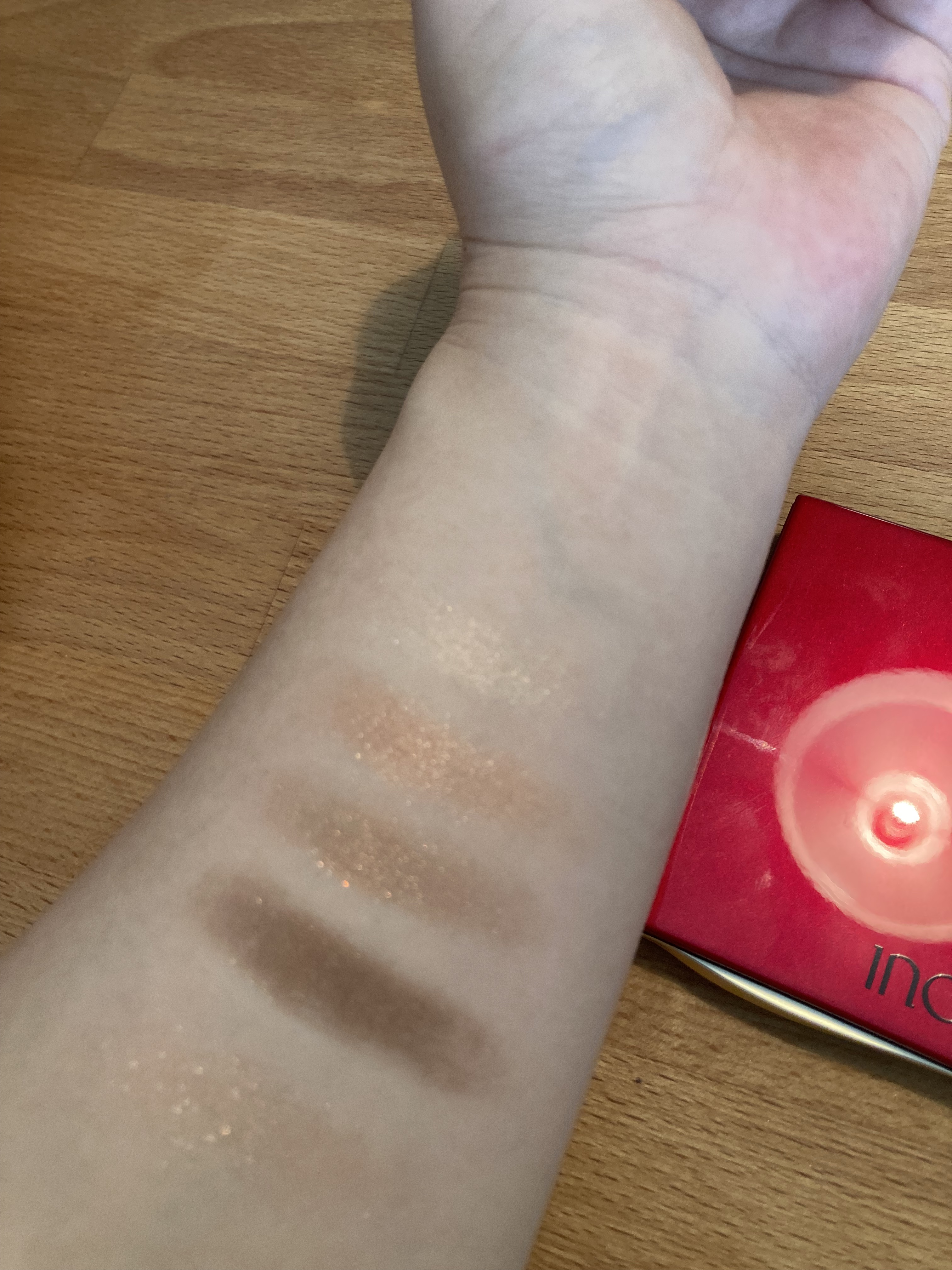 上品なカラー、ふわっさらっとした粉質。 こんな粉質初めてかも?左下のプライマーをはじめにつけることによって、もちがかなりよくなる オレンジがかなり上品なカラーで、右下の締め色にもラメが散りばめていて濃すぎないシアーな発色。 全体的にシアーな発色なので、ナチュラルにもメイクできます。 イエベ春の方に全力でおすすめしたいです。