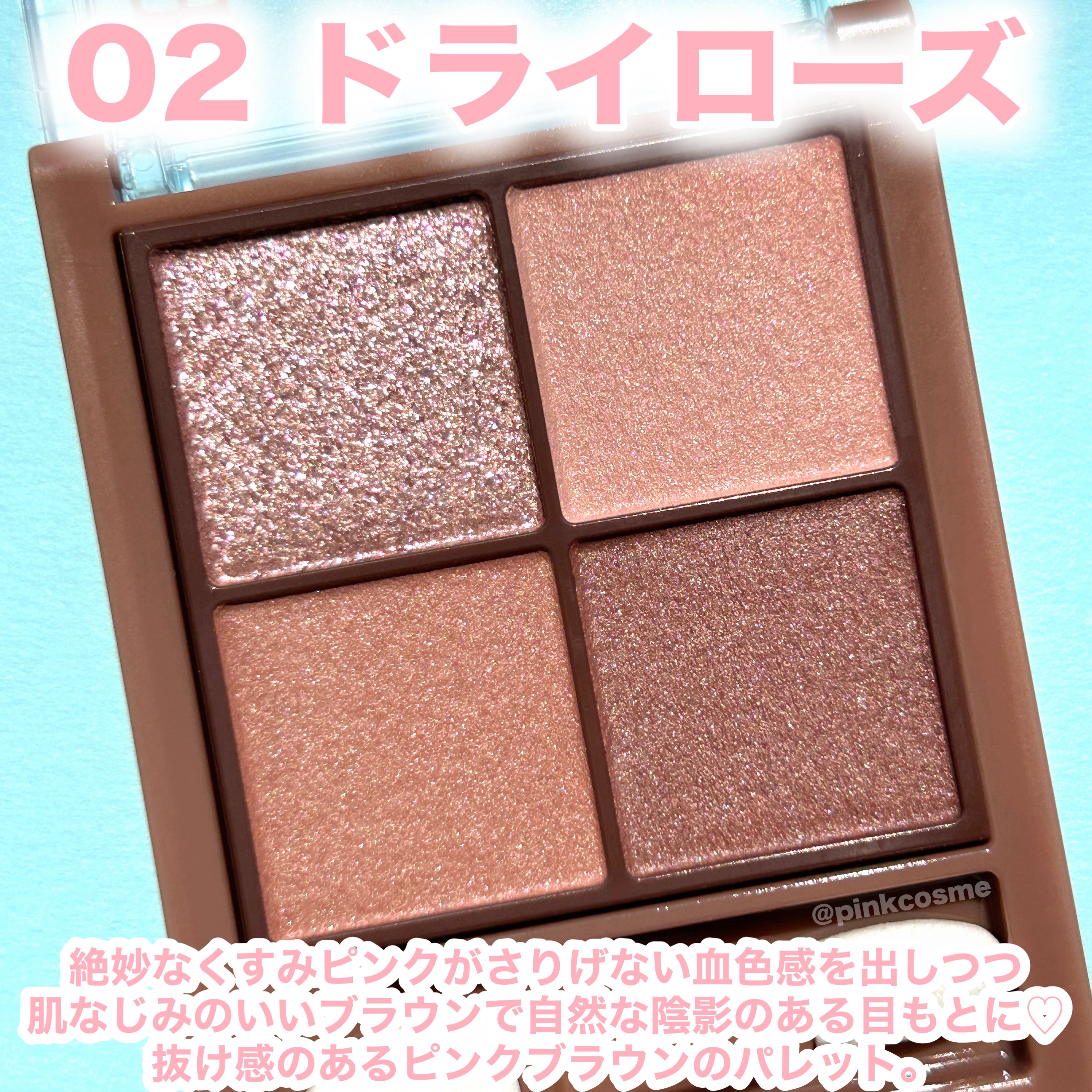 - 透け感マット×濃厚ブラウンの4色アイシャドウ。 しっかり目元を引き締めるビターなブラウンカラー。 透け感のあるブラウンを重ねて、自然な陰影のある目元へ。 ふんわり柔らかなパウダーなので、スルスル伸びてまぶたにピタッと密着。 保湿成分(スクワラン、ホホバ種子油)配合。
