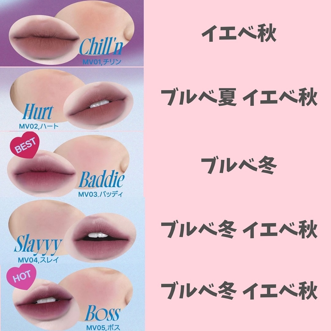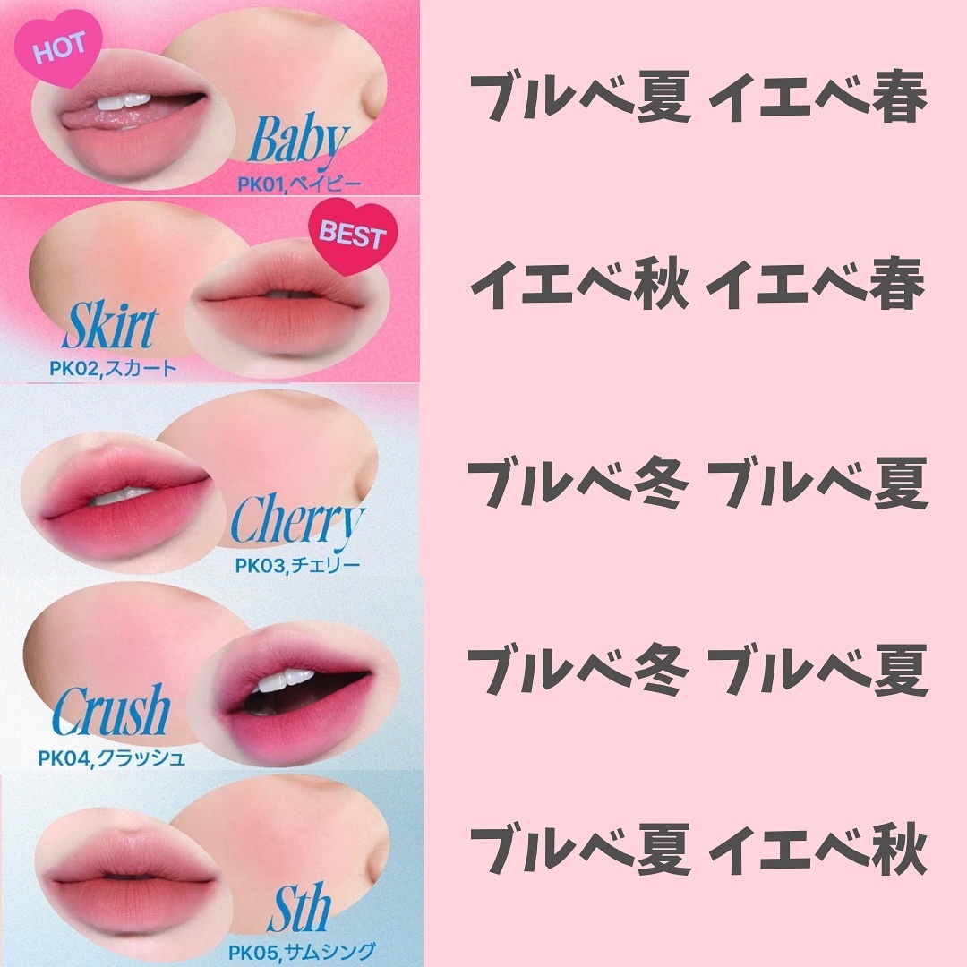 - <CR01 ディア> ダイメジメチコン、(ジメチコン/ビニルジメチコン)クロスポリマー、トリベヘニン、トリイソステアリン酸ポリグリセリル-2、リンゴ酸ジイソステアリル、合成フルオロフロゴパイト、二酸化チタン(CI 77891)、黄色酸化鉄(CI 77492)、カカオシードバター、ブルーアガベ葉エキス、セチルPEG/PPG-10/1ダイメチコン、イソステアリン酸ソルビタン、ビニルジメチコン/メチコンシルセスキオキサン)クロスポリマー、ポリヒドロキシステアリック酸、ジステアルジモニウムヘクトライト、パルミチン酸エチルヘキシル、ラウロイルサルコシン酸ナトリウム、アイソステアリック酸、レシチン、ジイソステアリン酸ポリグリセリル-2、ポリリシノレイン酸ポリグリセリル-3、クエン酸トリエチル、カプリリルグリコール、カプリル酸グリセリル、BG、精製水、香料、黄色5号(CI 15985)、赤色酸化鉄(CI 77491)、赤202(CI 15850)、黒色酸化鉄(CI 77499) <CR02 ボーイ> ダイメジメチコン、(ジメチコン/ビニルジメチコン)クロスポリマー、トリベヘニン、合成フルオロフロゴパイト、リンゴ酸ジイソステアリル、二酸化チタン(CI 77891)、トリイソステアリン酸ポリグリセリル-2、カカオシードバター、ブルーアガベ葉エキス、セチルPEG/PPG-10/1ダイメチコン、イソステアリン酸ソルビタン、ビニルジメチコン/メチコンシルセスキオキサン)クロスポリマー、ポリヒドロキシステアリック酸、ジステアルジモニウムヘクトライト、ジイソステアリン酸ポリグリセリル-2、パルミチン酸エチルヘキシル、ラウロイルサルコシン酸ナトリウム、アイソステアリック酸、レシチン、ポリリシノレイン酸ポリグリセリル-3、クエン酸トリエチル、カプリリルグリコール、カプリル酸グリセリル、BG、精製水、香料、黄色5号(CI 15985)、赤色104号(1) (CI 45410)、赤色酸化鉄(CI 77491)、赤202(CI 15850)、黄色4号(CI 19140) <CR03 ビーエフエフ> ダイメジメチコン、(ジメチコン/ビニルジメチコン)クロスポリマー、トリベヘニン、トリイソステアリン酸ポリグリセリル-2、リンゴ酸ジイソステアリル、合成フルオロフロゴパイト、二酸化チタン(CI 77891)、赤色104号(1) (CI 45410)、カカオシードバター、ブルーアガベ葉エキス、セチルPEG/PPG-10/1ダイメチコン、イソステアリン酸ソルビタン、ビニルジメチコン/メチコンシルセスキオキサン)クロスポリマー、ポリヒドロキシステアリック酸、ジイソステアリン酸ポリグリセリル-2、ジステアルジモニウムヘクトライト、パルミチン酸エチルヘキシル、ラウロイルサルコシン酸ナトリウム、アイソステアリック酸、レシチン、ポリリシノレイン酸ポリグリセリル-3、クエン酸トリエチル、カプリリルグリコール、カプリル酸グリセリル、BG、精製水、香料、黄色4号(CI 19140)、黄色酸化鉄(CI 77492)、赤202(CI 15850)、赤色201号 (CI 15850) <CR04 セブンティーン> ダイメジメチコン、(ジメチコン/ビニルジメチコン)クロスポリマー、トリベヘニン、リンゴ酸ジイソステアリル、トリイソステアリン酸ポリグリセリル-2、合成フルオロフロゴパイト、二酸化チタン、カカオシードバター、ブルーアガベ葉エキス、セチルPEG/PPG-10/1ダイメチコン、イソステアリン酸ソルビタン、ビニルジメチコン/メチコンシルセスキオキサン)クロスポリマー、ポリヒドロキシステアリック酸、ジステアルジモニウムヘクトライト、ジイソステアリン酸ポリグリセリル-2、パルミチン酸エチルヘキシル、ラウロイルサルコシン酸ナトリウム、アイソステアリック酸、レシチン、ポリリシノレイン酸ポリグリセリル-3、クエン酸トリエチル、カプリリルグリコール、カプリル酸グリセリル、BG、精製水、香料、赤色酸化鉄、赤色201号、黄色4号、赤色202号、黄色酸化鉄 <CR05 ガールズ> ダイメジメチコン、(ジメチコン/ビニルジメチコン)クロスポリマー、トリベヘニン、トリイソステアリン酸ポリグリセリル-2、合成フルオロフロゴパイト、黄色5号(CI 15985)、リンゴ酸ジイソステアリル、カカオシードバター、ブルーアガベ葉エキス、セチルPEG/PPG-10/1ダイメチコン、イソステアリン酸ソルビタン、ビニルジメチコン/メチコンシルセスキオキサン)クロスポリマー、ポリヒドロキシステアリック酸、ジイソステアリン酸ポリグリセリル-2、ジステアルジモニウムヘクトライト、パルミチン酸エチルヘキシル、ラウロイルサルコシン酸ナトリウム、アイソステアリック酸、レシチン、ポリリシノレイン酸ポリグリセリル-3、クエン酸トリエチル、カプリリルグリコール、カプリル酸グリセリル、BG、精製水、香料、黄色4号(CI 19140)、赤202(CI 15850)、二酸化チタン(CI 77891)、赤色201号 (CI 15850) <MV01 チリン> ダイメジメチコン、(ジメチコン/ビニルジメチコン)クロスポリマー、トリベヘニン、トリイソステアリン酸ポリグリセリル-2、リンゴ酸ジイソステアリル、合成フルオロフロゴパイト、酸化チタン (CI 77891)、赤色酸化鉄(CI 77491)、黄色酸化鉄(CI 77492)、カカオシードバター、ブルーアガベ葉エキス、セチルPEG/PPG-10/1ダイメチコン、イソス
