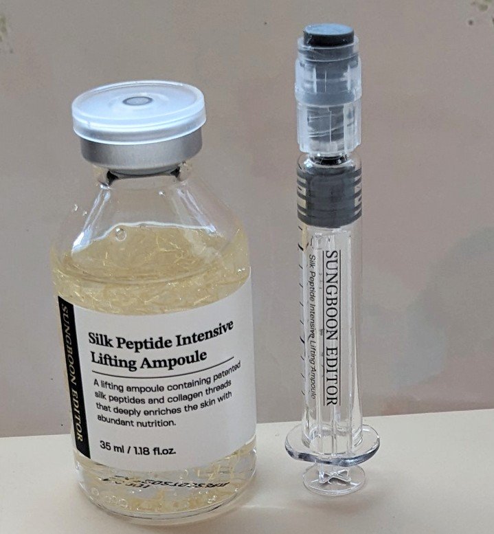 金色の糸が入った美容液なんて初めて見たSUNGBOONEDITOR成分エディターシルクペプチドインテンシブリフティングアンプル35ml注射器で吸い上げて使う珍しい形の美容液です。金色のコラーゲン糸が入っていて、潤いとハリが供給されるんだとか。...