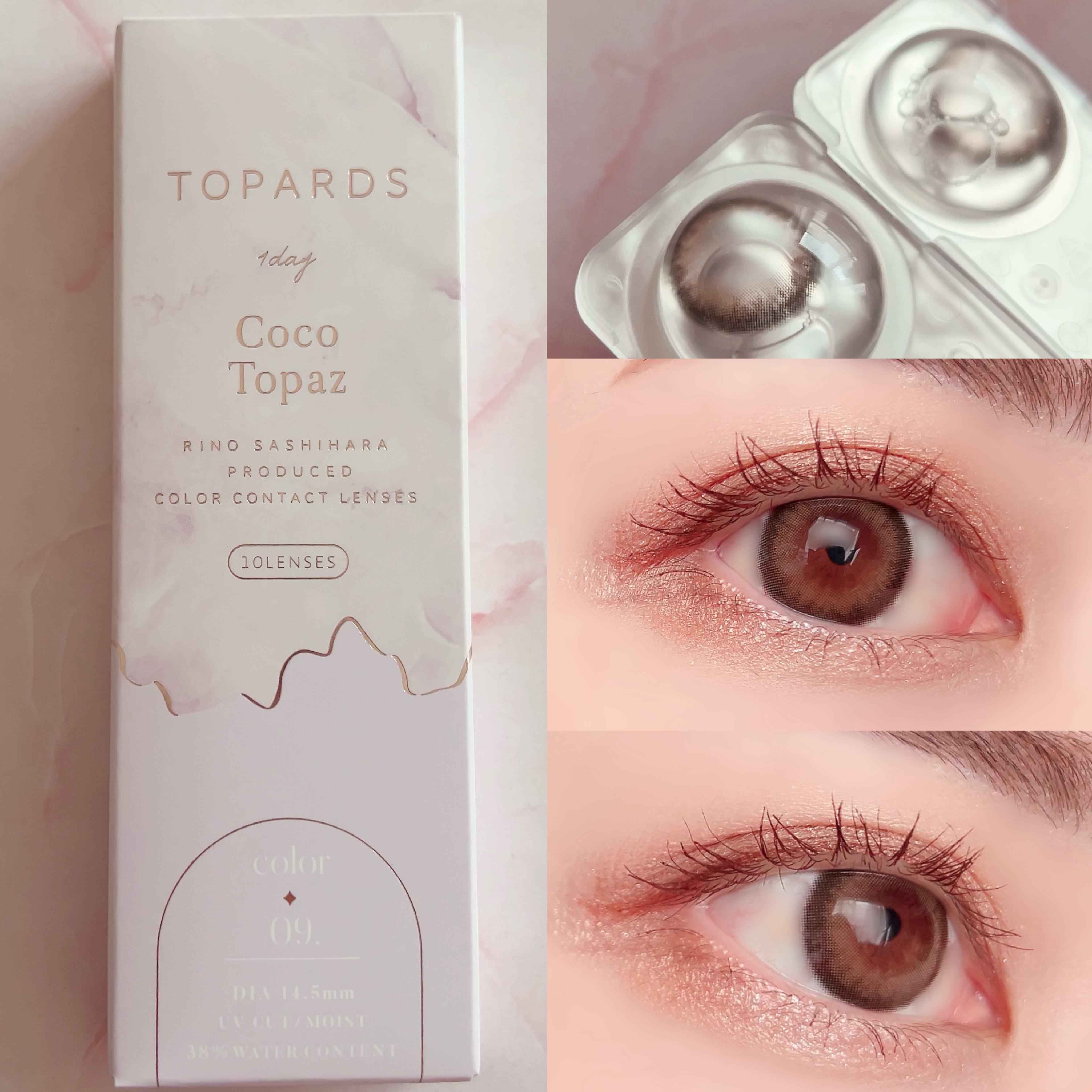 トパーズ使用カラー:ココトパーズうるツヤきゅるん明るめブラウン・オレンジブラウン系カラーくすみ感がありつつ透明感のあるレンズ大きめサイズ×中太フチでしっかり盛れるけど派手すぎない。お気に入りでリピしてます💖【スペック】1day/DIA14.5...