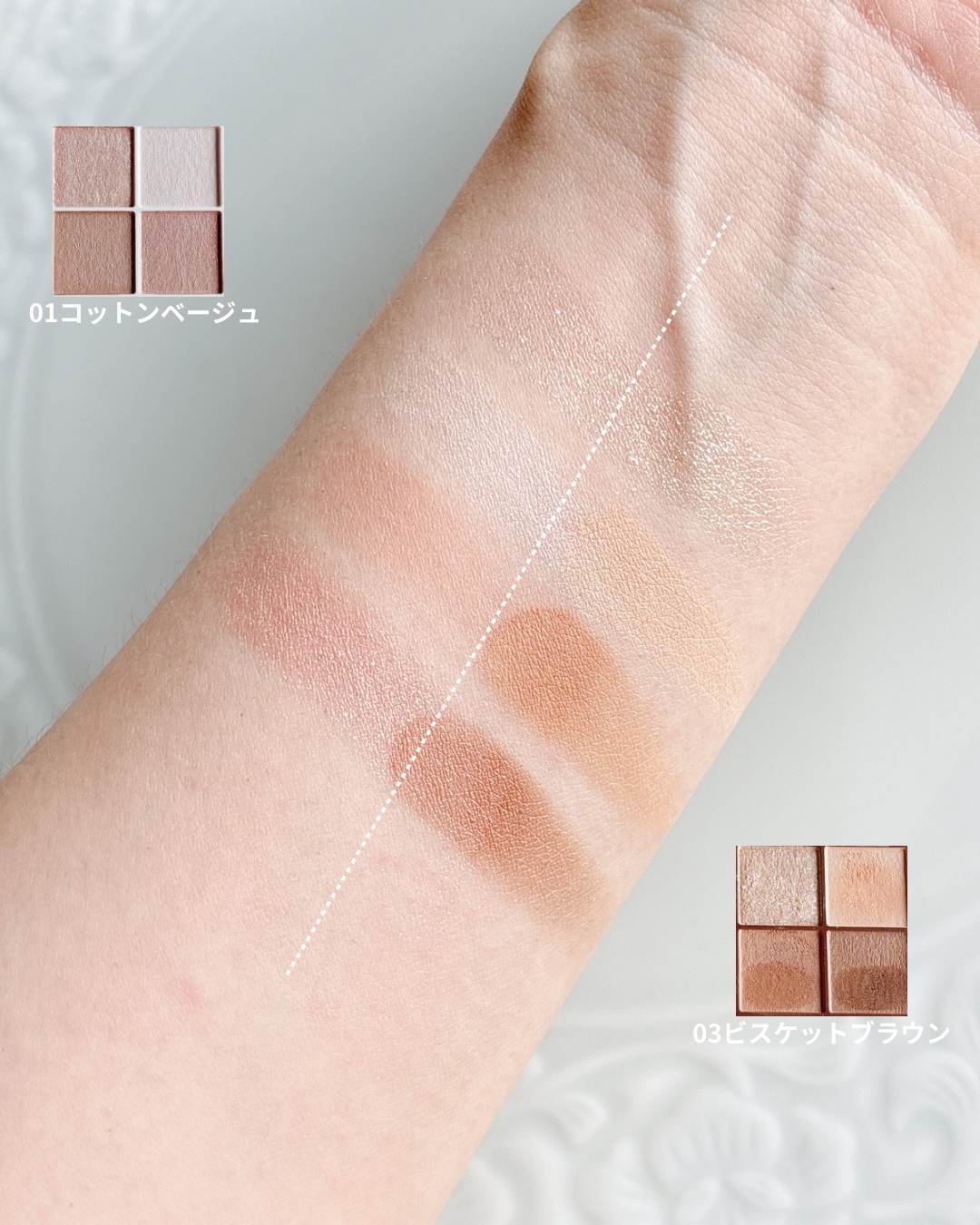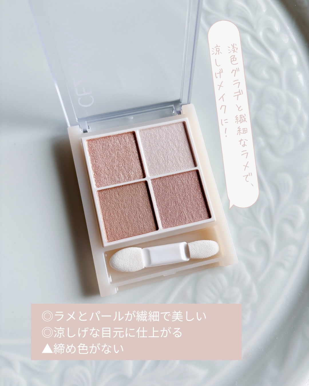 - 淡色グラデでソフトな陰影を作る4色アイシャドウ。