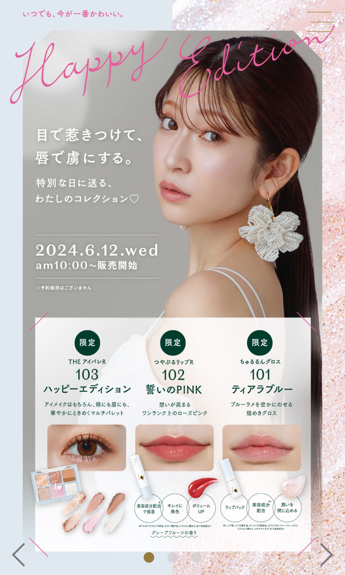 - 【重ねて塗って、唇だけで虜にする。】 むっちりぷっくり*1艶リップを演出♥ 24SS新定番発売! 「スキンケア感覚の艶グロス」 “ちゅるるんグロス” ラップパック×美容成分配合*2×潤いを閉じ込める こっくり系テクスチャーでぷっくりツヤツヤ。 美容成分がたっぷりで、ぴったり密着ラッピング。 乾燥から唇を保護します。 ぽってり*1♡うるちゅるな唇を演出。 ♥「01 ヌードスキン」うるうるしながら、可愛く守る。 *1 メイク効果による *2 シア脂、ツバキ種子油、カニナバラ果実油、セラミドNP、ティーツリーエキス、ヒアルロン酸Na、ツボクサエキス(全て保湿成分) うるうるしながら、可愛く守る。 スキンケア感覚の艶グロス。