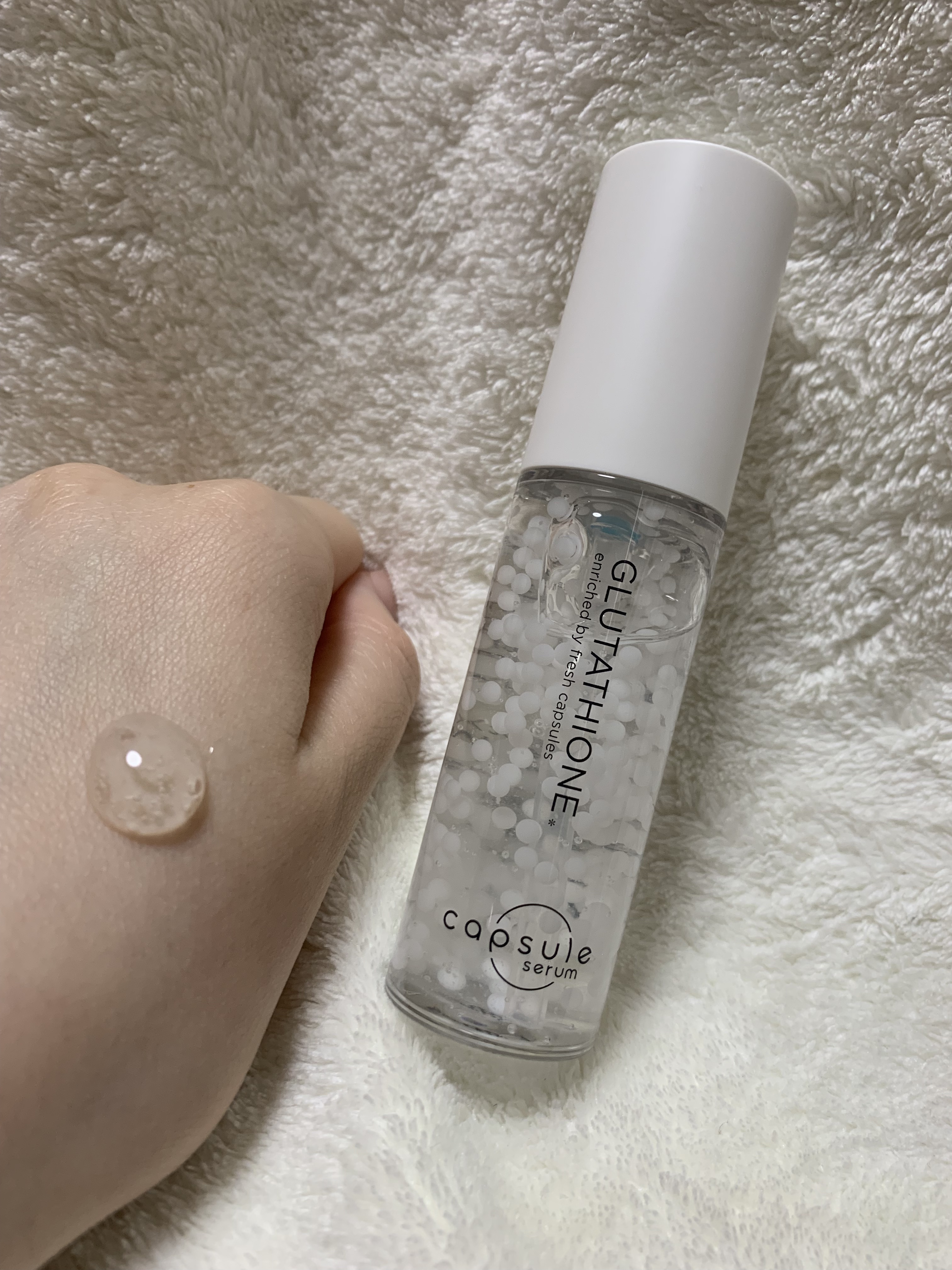 カプセルセラムは美容成分をカプセルに凝縮し、使うたびに弾ける生美容液。 グルタチオンは美容クリニックでも人気の成分で、くすみや肌のきめの乱れに悩む人にぴったり! しっとりとした後肌ですがベタつきは皆無。朝のスキンケアにも使いやすいテクスチャーです✨