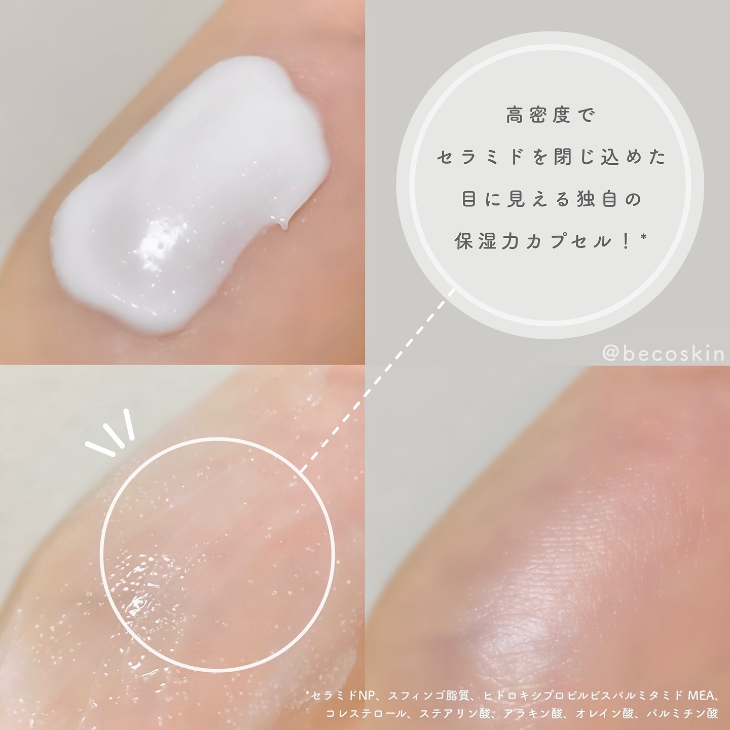 - 独自技術を用いた「高密度セラミドカプセル*¹」を1本に約100万個配合しそのつぶつぶと目に見えるカプセルが肌上で柔らかく溶けて角質層のすみずみまでうるおいで満たします。 保湿が120時間*⁵持続することでも人気を博しており乾燥しやすい敏感な肌におすすめのクリームです。 無香料、無着色、パラベン無添加、エタノール無添加、皮膚科医の協力のもとテスト済み*⁶ *1 セラミドNP、スフィンゴ脂質、ヒドロキシプロピルビスパルミタミドMEA、コレステロール、ステアリン酸、アラキン酸、オレイン酸、パルミチン酸 *5 ㈱エリード 2023.2.20~2023.3.23 敏感肌で乾燥悩みのある女性32人対象の人体適用試験実施(個人差があります) *6 全ての人に肌トラブル、アレルギーがおきないわけではありません。