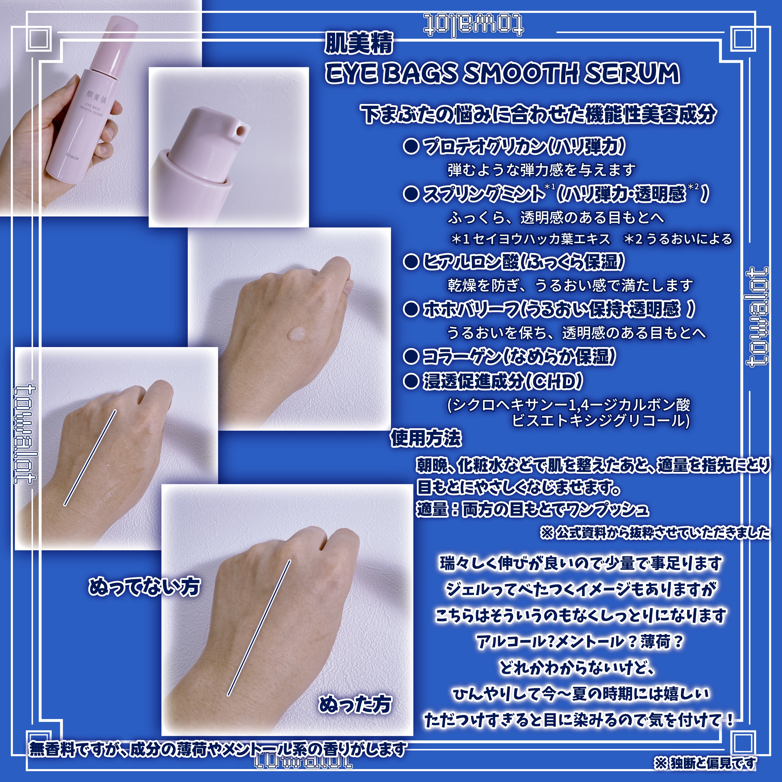 これからの季節目元の乾燥が気になるので、肌美精アイバッグスムースセラムを試しに買ってみました!下まぶたのハリ不足に潤いと弾力を与えてくれて、肌をスッキリ引き締めてくれるそう✨まだ使い始めたばかりなので効果はあまり出ていませんが、滑らかなジェル...