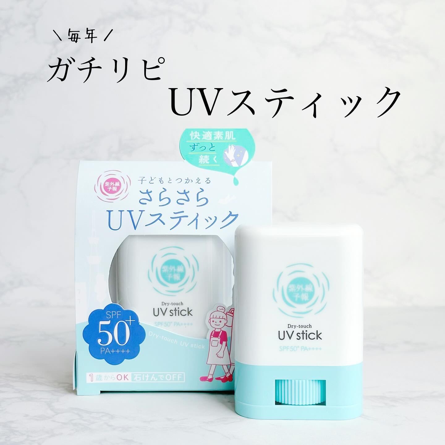 手が汚れないから塗り直しにもピッタリ! スティックタイプの日焼け止めです サッと塗るだけ、でもすぐサラサラ✨ 外出先でも塗り直しがしやすいのが良かった 1歳から使えるやさしい製品です