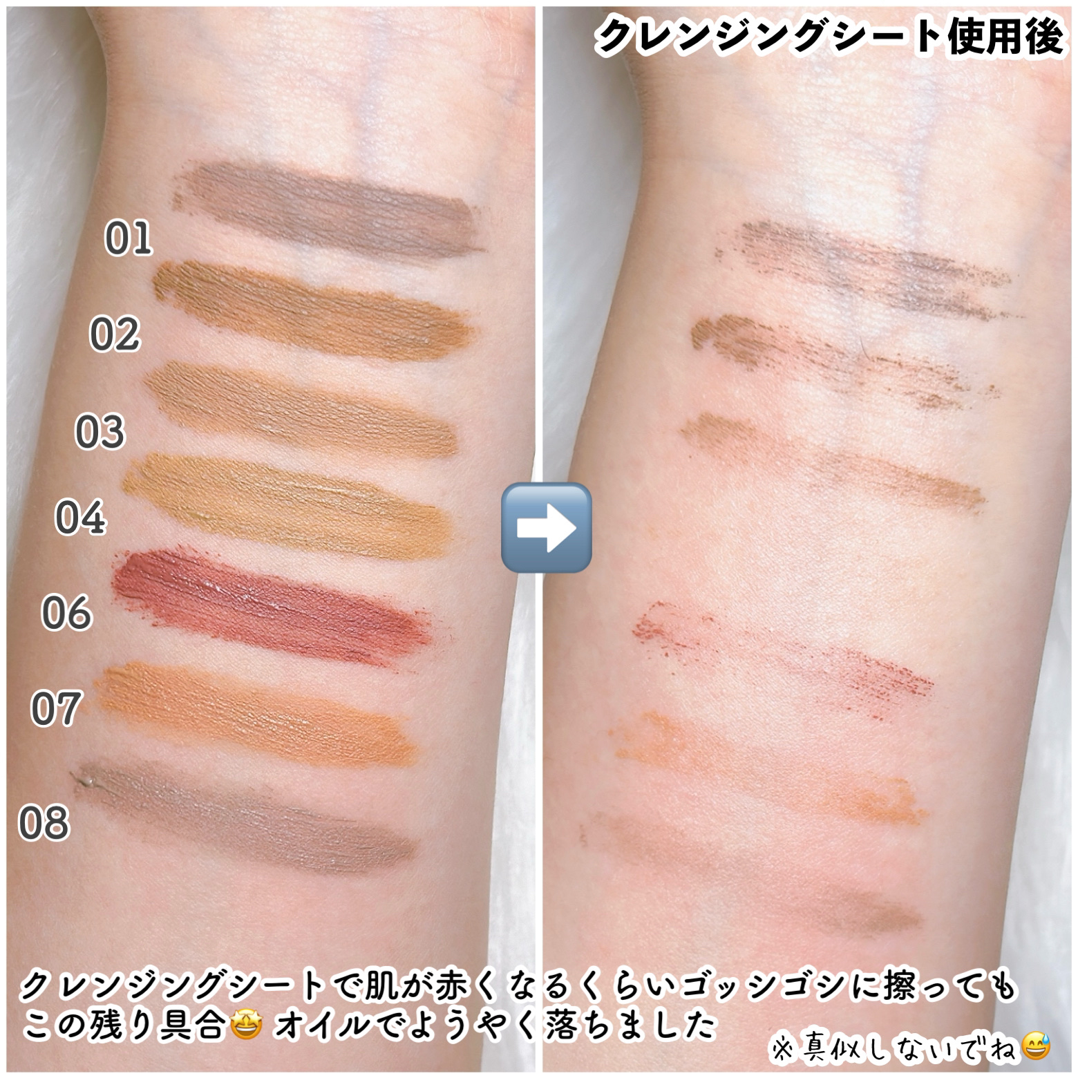 - <01 グレーストープ(GRACE TAUPE)> イソドデカン、トリメチルシロキシケイ酸、セレシン、タルク、酸化チタン、ジステアルジモニウムヘクトライト、マイクロクリスタリンワックス、パルミチン酸デキストリン、酸化鉄、炭酸プロピレン、ポリプロピルシルセスキオキサン、(パルミチン酸/エチルヘキサン酸)デキストリン、イソステアリン酸PEG-20グリセリル、ポリイソブテン、ポリメチルシルセスキオキサン、トリエトキシカプリリルシラン、カプリル酸グリセリル、シリカ <02 マイルドウッディー(MILD WOODY)> イソドデカン、トリメチルシロキシケイ酸、セレシン、タルク、ジステアルジモニウムヘクトライト、マイクロクリスタリンワックス、酸化チタン、パルミチン酸デキストリン、酸化鉄、炭酸プロピレン、ポリプロピルシルセスキオキサン、(パルミチン酸/エチルヘキサン酸)デキストリン、イソステアリン酸PEG-20グリセリル、ポリイソブテン、ポリメチルシルセスキオキサン、トリエトキシカプリリルシラン、カプリル酸グリセリル、シリカ <03 モダンベージュ(MODERN BEIGE)> イソドデカン、トリメチルシロキシケイ酸、セレシン、酸化チタン、タルク、ジステアルジモニウムヘクトライト、マイクロクリスタリンワックス、パルミチン酸デキストリン、酸化鉄、炭酸プロピレン、ポリプロピルシルセスキオキサン、パルミチン酸/エチルヘキサン酸)デキストリン、イソステアリン酸PEG-20グリセリル、ポリイソブテン、ポリメチルシルセスキオキサン、トリエトキシカプリリルシラン、カプリル酸グリセリル、シリカ <04 メリーブロンディー(MERRY BLONDY)> イソドデカン、トリメチルシロキシケイ酸、セレシン、タルク、酸化チタン、ジステアルジモニウムヘクトライト、マイクロクリスタリンワックス、パルミチン酸デキストリン、酸化鉄、炭酸プロピレン、ポリプロピルシルセスキオキサン、(パルミチン酸/エチルヘキサン酸)デキストリン、イソステアリン酸PEG-20グリセリル、ポリイソブテン、ポリメチルシルセスキオキサン、トリエトキシカプリリルシラン、カプリル酸グリセリル、シリカ <05 ダスキーローズ(DUSKY ROSE)(日本限定)> イソドデカン、トリメチルシロキシケイ酸、セレシン、二酸化チタン、タルク、ジステアルジモニウムヘクトライト、マイクロクリスタリンワックス、パルミチン酸デキストリン、炭酸プロピレン、酸化鉄、ポリプロピルシルセスキオキサン、(パルミチン酸/エチルヘキサン酸)デキストリン、イソステアリン酸PEG-20グリセリル、ポリイソブテン、グンジョウ、トリエトキシカプリリルシラン、カプリル酸グリセリル <06 ベリーオーキッド(BERRY ORCHID)(日本限定)> イソドデカン、トリメチルシロキシケイ酸、タルク、セレシン、ジステアルジモニウムヘクトライト、マイクロクリスタリンワックス、二酸化チタン、パルミチン酸デキストリン、酸化鉄、炭酸プロピレン、コチニール、ポリプロピルシルセスキオキサン、(パルミチン酸/エチルヘキサン酸)デキストリン、イソステアリン酸PEG-20グリセリル、ポリイソブテン、トリエトキシカプリリルシラン、カプリル酸グリセリル、マルトデキストリン <07 アプリコットタン(APRICOT TAN)> イソドデカン、トリメチルシロキシケイ酸、セレシン、タルク、ジステアルジモニウムヘクトライト、マイクロクリスタリンワックス、酸化チタン、パルミチン酸デキストリン、グンジョウ、酸化鉄、炭酸プロピレン、ポリプロピルシルセスキオキサン、(パルミチン酸/エチルヘキサン酸)デキストリン、イソステアリン酸PEG-20グリセリル、ポリイソブテン、トリエトキシカプリリルシラン、カプリル酸グリセリル <08 ムーングレー(MOON GRAY)> イソドデカン、トリメチルシロキシケイ酸、酸化チタン、セレシン、タルク、ジステアルジモニウムヘクトライト、マイクロクリスタリンワックス、パルミチン酸デキストリン、酸化鉄、炭酸プロピレン、ポリプロピルシルセスキオキサン、(パルミチン酸/エチルヘキサン酸)デキストリン、イソステアリン酸PEG-20グリセリル、ポリイソブテン、トリエトキシカプリリルシラン、カプリル酸グリセリル <09 サンドグレー(SAND GREY)> イソドデカン、トリメチルシロキシケイ酸、酸化チタン、セレシン、ジステアルジモニウムヘクトライト、マイクロクリスタリンワックス、タルク、パルミチン酸デキストリン、炭酸プロピレン、ポリプロピルシルセスキオキサン、(パルミチン酸/エチルヘキサン酸)デキストリン、イソステアリン酸PEG-20グリセリル、ポリイソブテン、酸化鉄、トリエトキシカプリリルシラン、カプリル酸グリセリル <10 ブロッサムグレー(BLOSSOM GREY)> イソドデカン、トリメチルシロキシケイ酸、酸化チタン、セレシン、タルク、ジステアルジモニウムヘクトライト、マイクロクリスタリンワックス、パルミチン酸デキストリン、炭酸プロピレン、ポリプロピルシルセスキオキサン、(パルミチン酸/エチルヘキサン酸)デキストリン、イソステアリ