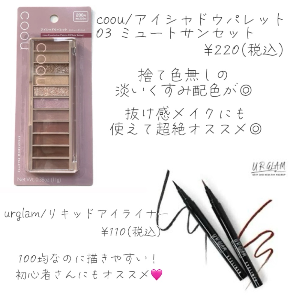 プチプラ高発色♪ダイソーで見つけたURGLAMブラッシュリキッドアイライナー01¥220(税込)ダイソーで筆タイプのアイライナー買えるの?!って思いません?!私は目尻をくるんって描くのが好きなんだけど、極細だから使いやすい♪力を入れずにするん...
