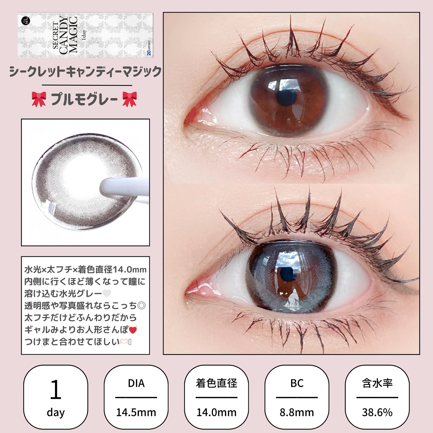 \ラメがキラキラで可愛すぎる♡キャンマジ新作/🛒キャンマジシークレットキャンディーマジック使用期限:1日枚数:1箱20枚入DIA(直径):14.5mm着色直径:14.0mm(体感13.8mm)BC(ベースカーブ):8.6mm含水率:58%度数...