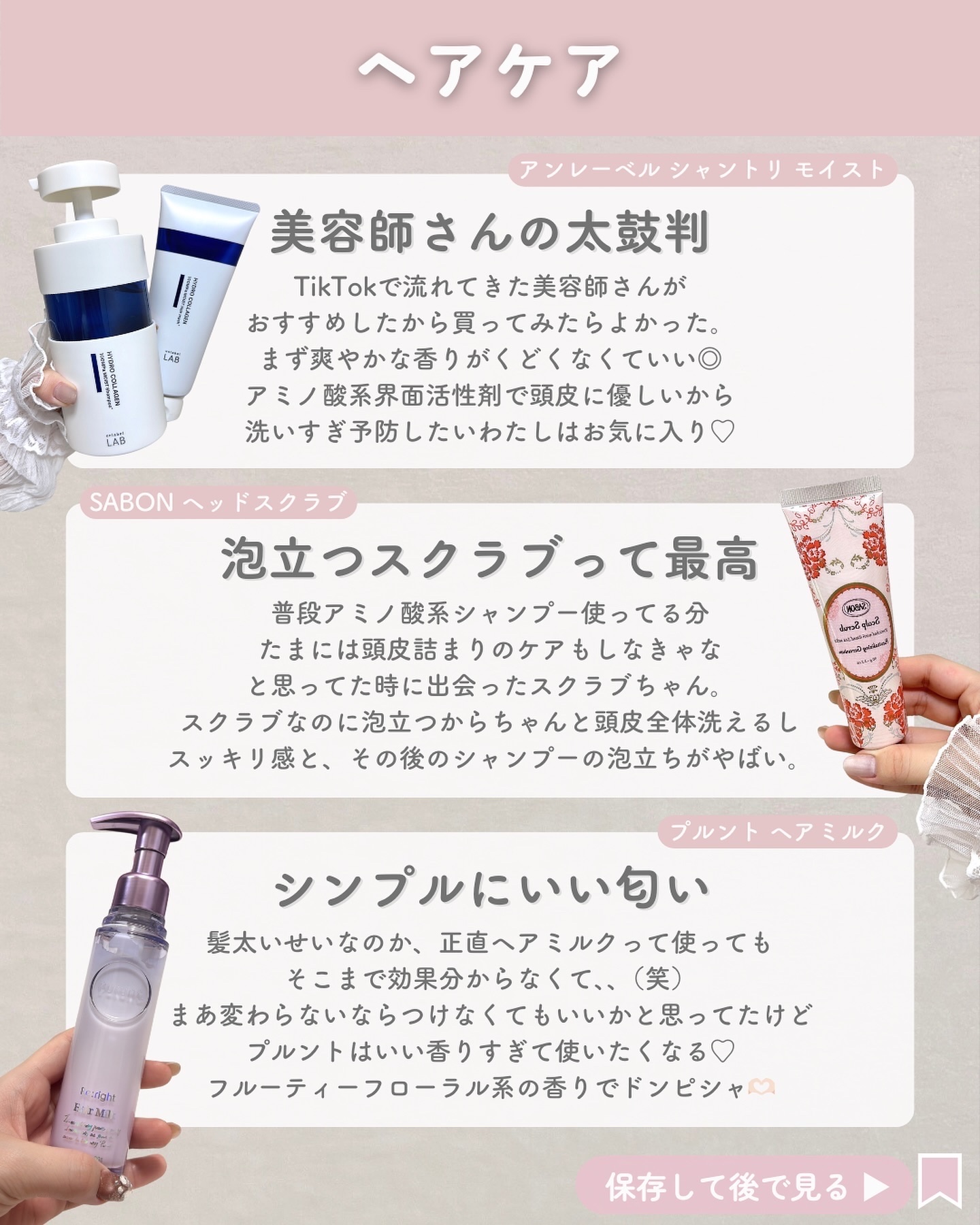 私のおすすめはアミノ酸系シャンプーですが、合う合わないがあるから、全ての人に当てはまるわけではないです! 地肌の乾燥が気になる方やシャンプーを流した後にキシキシする方はぜひ使ってみて欲しい🔥🔥 ゴムで結ばない方がいいのは乾いた髪も一緒だから、普段からクリップを使うのがおすすめ! ミルク&オイルも、髪質によって合う合わないがあるから髪質と相談しながら使ってみてね〰️✨ 乾燥によってパサつく 広がった髪でまとまりがきかない 切れ毛や枝毛のケアを行いたい ツヤが欲しい まとまりにくい髪質の方 複数回のカラーパーマでダメージヘアの方