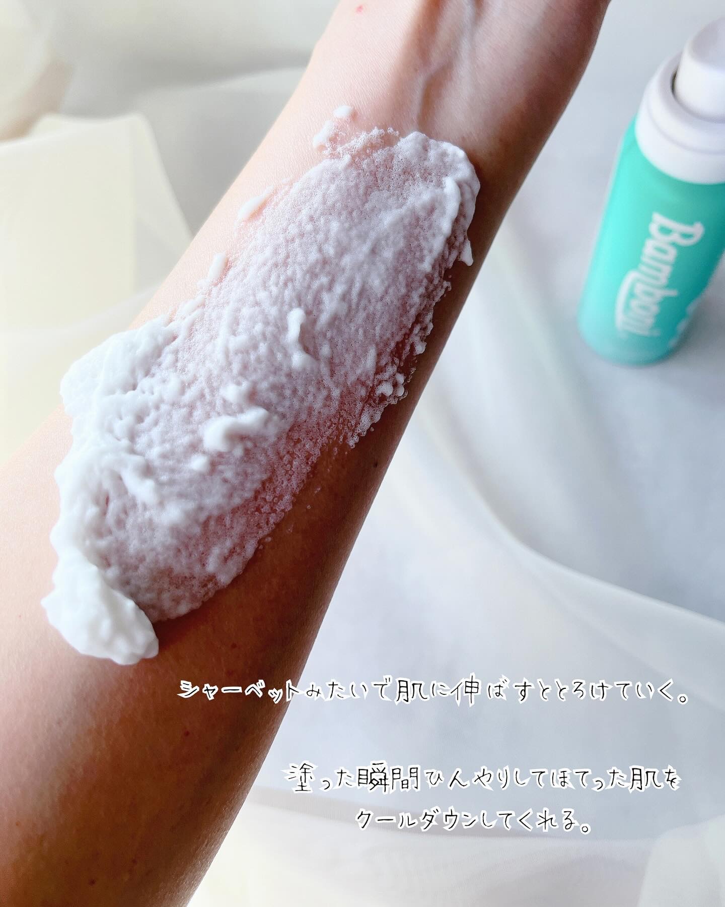 ホイップタイプの日焼け止めは初めて😳🫧 ふわふわっと軽いエアリーサンケア☀️ シャーベットのようなテクスチャー。 肌にのせるとひんやり感𓂃𓈒𓏸 ほてった肌をクールダウンさせてくれるよ♡ ふわもち泡クセになります🤍