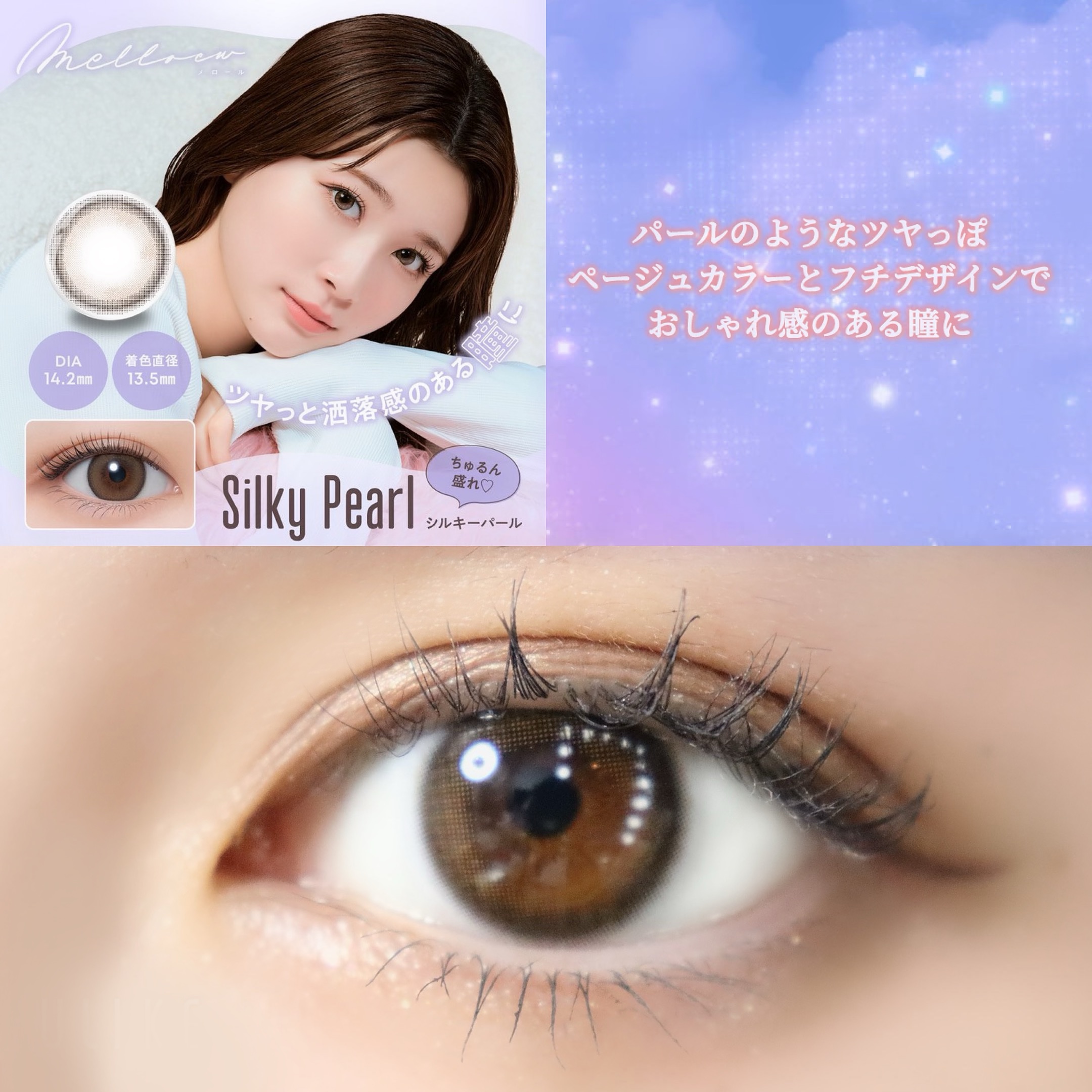 ▼ツヤっと洒落感のある瞳に👀💓【melloew/SilkyPearl】melloew(メロール)カラー:シルキーパール全7色/各1,485円(税込)《レンズスペック》使用期間:1dayレンズ直径(DIA):14.2mm着色直径(GDIA...