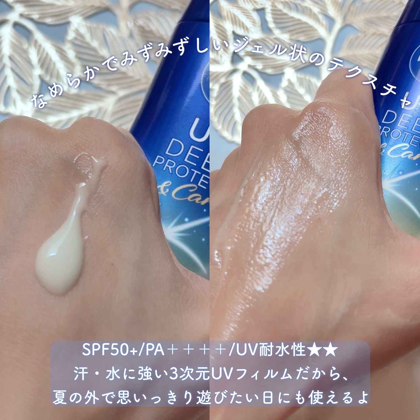 - 全身たっぷり使えるのびのいいジェル 強力紫外線をしっかりブロックしながら、予防美容(日やけによるシミ予防*1)ができる美容ケアUV *1日やけによるシミ・ソバカスを防ぐ ■SPF50+/PA++++ ハリ・弾力低下の原因となるUV-Aも、主にシミの原因となる UV-Bも防ぎます。 ■汗・水に強い3次元UVフィルムを採用 スーパーウォータープルーフで汗・水に触れても強力紫外線をカットします。(80分間の耐水試験で確認済み) ●日やけによるシミ・そばかすを防ぎながら、肌にうるおいを与えます。美容液成分★(保湿)配合。 ★ジェル:金銀花エキス*5、真珠タンパク抽出液*6、ダマスクバラ花水、BG ★エッセンス: 金銀花エキス*5、真珠タンパク抽出液*6、チューベロース多糖体、BG *5スイカズラ花エキス *6 加水分解コンキオリン ●乾燥による小ジワを目立たなくする*3 *3効能評価試験済み ●さわって驚く密着感とうるおい感のある使い心地