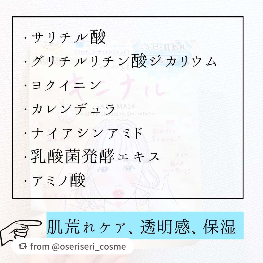- <キニナんねんマスク(関西エリア限定パッケージ)> ジグリセリン、キサンタンガム、ニコチン酸アミド、グリチルリチン酸ジカリウム、精製水、ジプロピレングリコール、エデト酸二ナトリウム、ポリオキシエチレンポリオキシプロピレンデシルテトラデシルエーテル、1,3-ブチレングリコール、リン酸L-アスコルビルマグネシウム、アクリル酸・メタクリル酸アルキル共重合体、天然ビタミンE、サリチル酸、水酸化ナトリウム、リン酸一水素ナトリウム、リン酸二水素ナトリウム、ヨクイニンエキス、L-セリン、セイヨウナシ果汁発酵液、トウキンセンカエキス