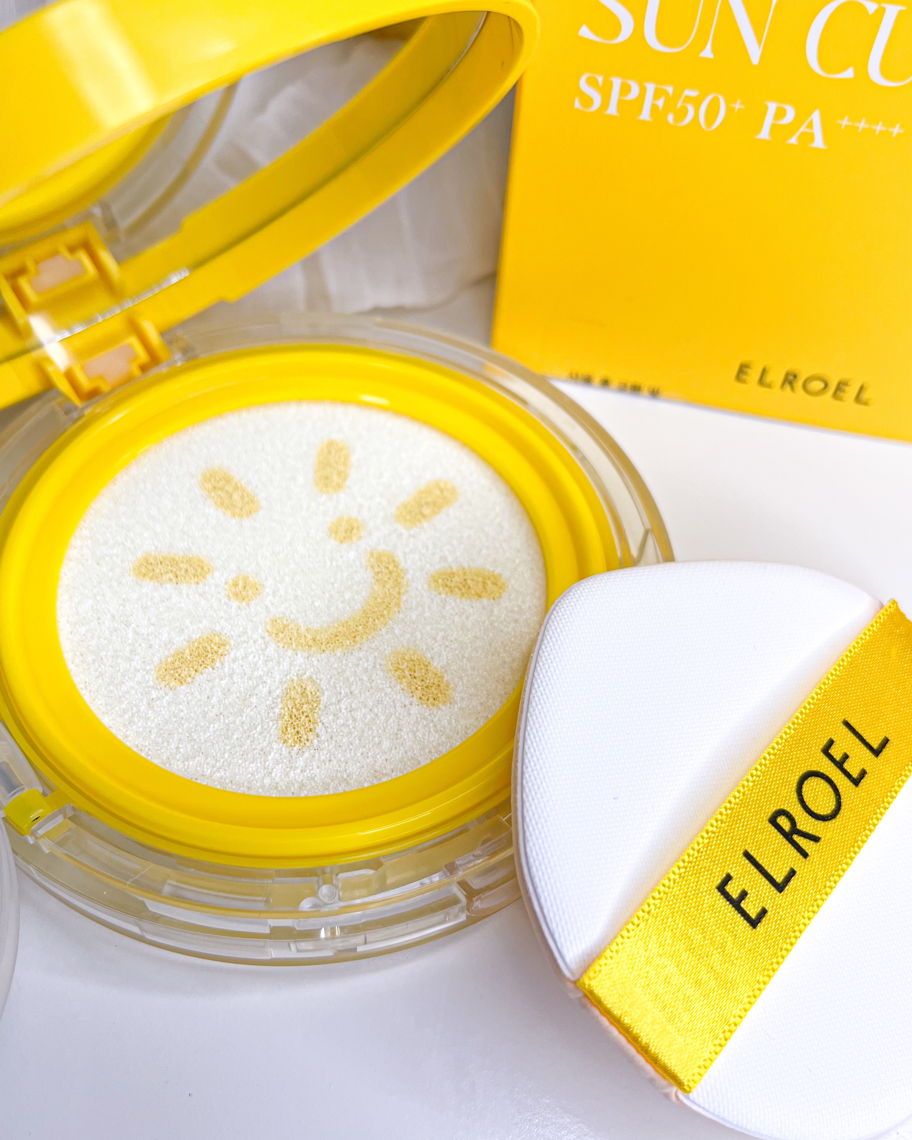 ELROELイエローサンクッション💛☀️SPF50+PA++++クッションタイプの日焼け止め♡クッションの太陽マークが可愛すぎる☀️みずみずしいテクスチャーでぽんぽん馴染ませると白浮きせず、しっとりひんやり仕上がり💛下地としてもお直しとしてメ...
