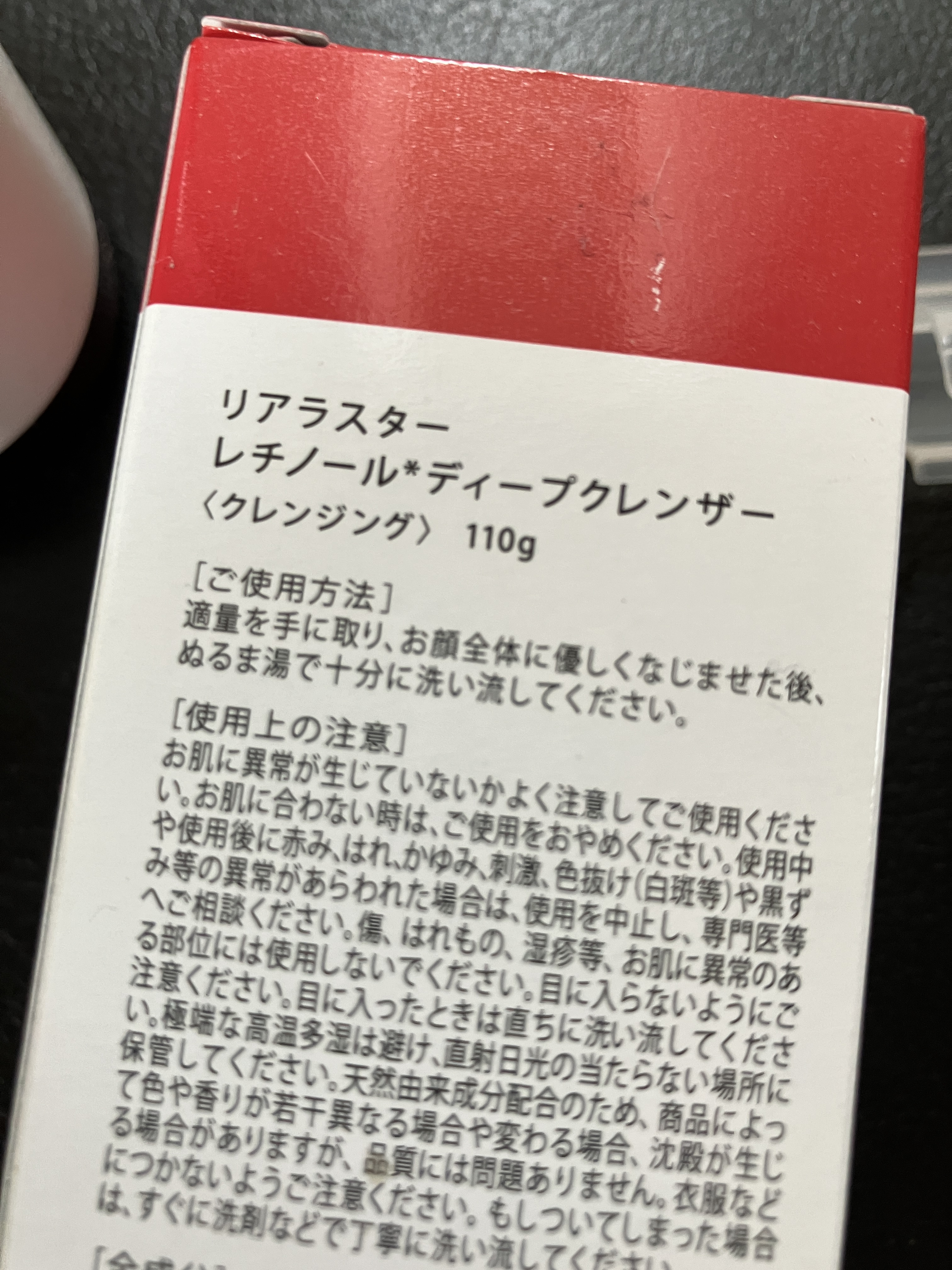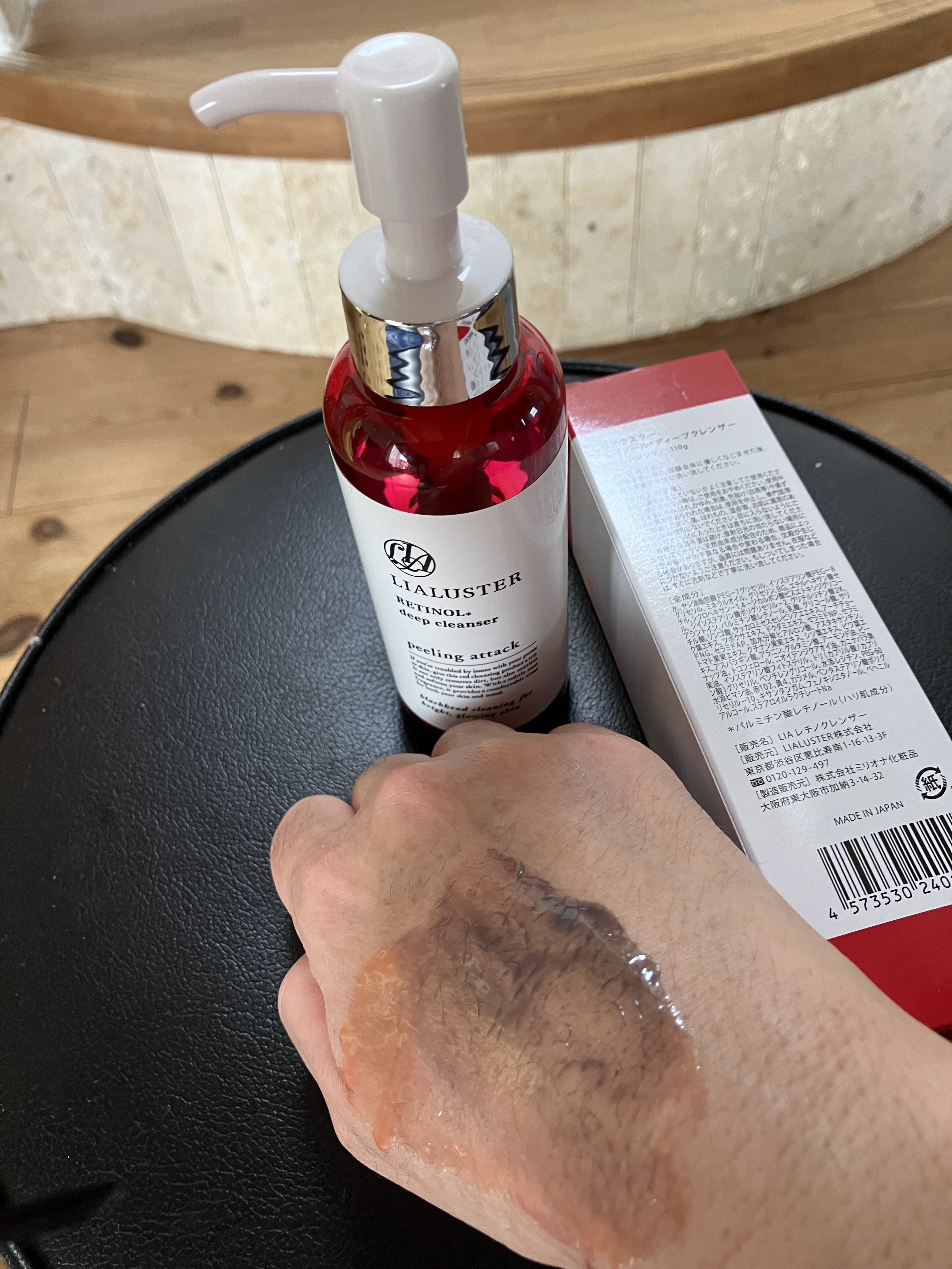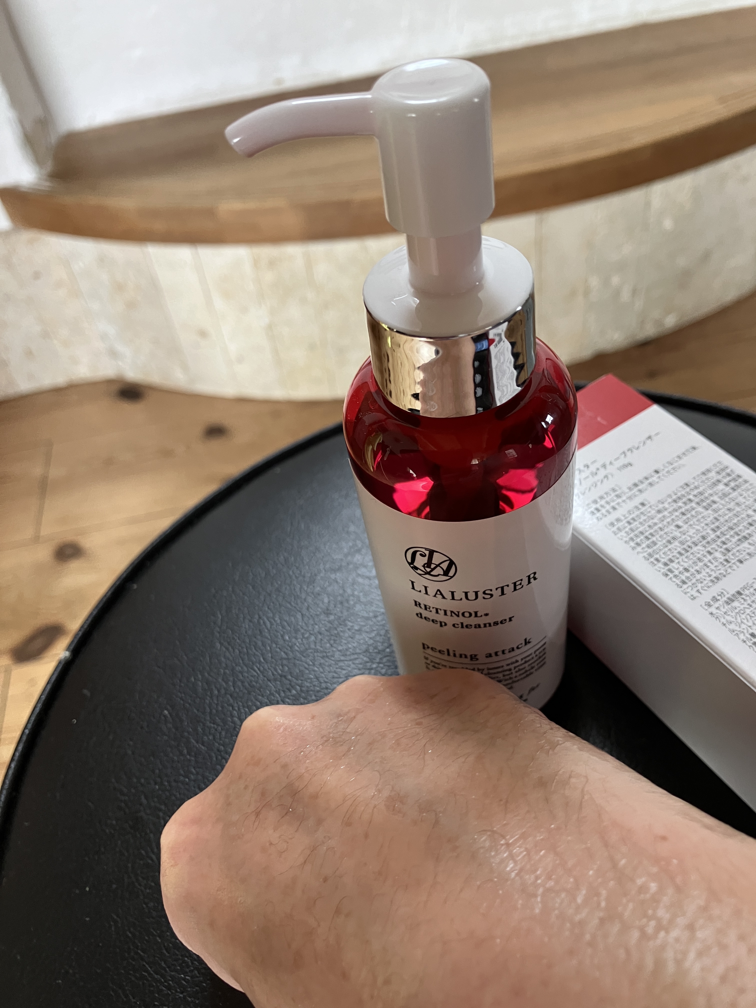 レチノールで洗う新世代のリキッド状クレンジング 【 LIALUSTER レチノールディープクレンザー 】 クレンジングは見た目も珍しい赤色 アスタキサンチンやトマト果実エキスなどの美肌菌由来成分を赤いカプセルに閉じ込めたためなんだって 洗い上がりは、しっとり、ツルッとした使用感です エタノール、シリコン、タルク、合成香料、紫外線吸収剤と5つの無添加も嬉しい