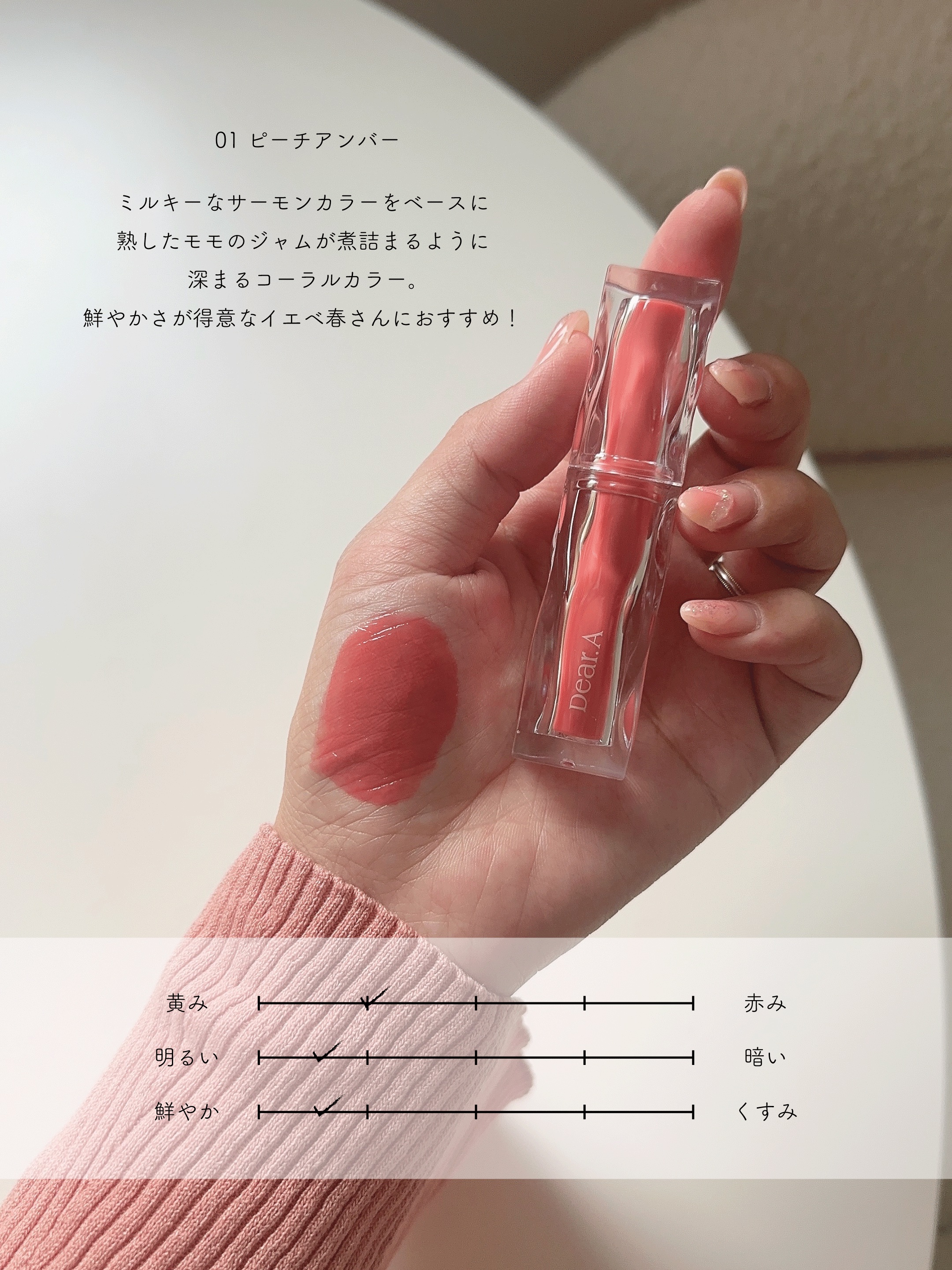 - <01. ピーチアンバー> 水、リンゴ酸ジイソステアリル、ビスジグリセリルポリアシルアジペート-2、ジフェニルシロキシフェニルトリメチコン、ジフェニルジメチコン、水添ポリイソブテン、BG、グリセリン、1,2-ヘキサンジオール、セテアレス-20、セテアリルアルコール、セチルPEG/PPG-10/1ジメチコン、(アクリル酸ヒドロキシエチル/アクリロイルジメチルタウリンNa)コポリマー、ポリソルベート60、フェノキシエタノール、スクワラン、香料、エチルヘキシルグリセリン、EDTA-2Na、イソステアリン酸ソルビタン、水酸化Al、ポリアクリル酸アンモニウム、ホホバ種子油、月見草油、アボカド油、モモ果実エキス、ステアリン酸Na、クエン酸、テトラ(ジ-t-ブチルヒドロキシヒドロケイヒ酸)ペンタエリスリチル、クダモノトケイソウ果実エキス、ヤエヤマアオキ果実エキス、ミルシアリアデュビア果実エキス、アンマロク果実エキス、ヒポファエラムノイデス果実エキス、テルミナリアフェルジナンジアナ果実エキス、酸化チタン、黄5、赤227、赤104(1)、黄4、青1 <02.アプリコットサイダー> 水、リンゴ酸ジイソステアリル、ビスジグリセリルポリアシルアジペート-2、ジフェニルシロキシフェニルトリメチコン、水添ポリイソブテン、ジフェニルジメチコン、BG、グリセリン、1,2-ヘキサンジオール、セテアレス-20、セテアリルアルコール、セチルPEG/PPG-10/1ジメチコン、(アクリル酸ヒドロキシエチル/アクリロイルジメチルタウリンNa)コポリマー、ポリソルベート60、フェノキシエタノール、スクワラン、香料、エチルヘキシルグリセリン、EDTA-2Na、イソステアリン酸ソルビタン、アボカド油、ホホバ種子油、月見草油、モモ果実エキス、ステアリン酸Na、クエン酸、テトラ(ジ-t-ブチルヒドロキシヒドロケイヒ酸)ペンタエリスリチル、アンマロク果実エキス、クダモノトケイソウ果実エキス、ヒポファエラムノイデス果実エキス、テルミナリアフェルジナンジアナ果実エキス、ヤエヤマアオキ果実エキス、ミルシアリアデュビア果実エキス、酸化チタン、黄5、赤227、赤104(1)、青1 <03.モロッコホリデーズ> 水、リンゴ酸ジイソステアリル、ビスジグリセリルポリアシルアジペート-2、ジフェニルシロキシフェニルトリメチコン、ジフェニルジメチコン、水添ポリイソブテン、BG、グリセリン、1,2-ヘキサンジオール、セテアレス-20、セテアリルアルコール、セチルPEG/PPG-10/1ジメチコン、(アクリル酸ヒドロキシエチル/アクリロイルジメチルタウリンNa)コポリマー、ポリソルベート60、フェノキシエタノール、スクワラン、香料、エチルヘキシルグリセリン、EDTA-2Na、イソステアリン酸ソルビタン、水酸化Al、ポリアクリル酸アンモニウム、ホホバ種子油、月見草油、アボカド油、モモ果実エキス、ステアリン酸Na、クエン酸、テトラ(ジ-t-ブチルヒドロキシヒドロケイヒ酸)ペンタエリスリチル、クダモノトケイソウ果実エキス、ヤエヤマアオキ果実エキス、ミルシアリアデュビア果実エキス、アンマロク果実エキス、ヒポファエラムノイデス果実エキス、テルミナリアフェルジナンジアナ果実エキス、酸化チタン、黄5、赤227、赤104(1)、青1、黄4 <04. リトルモーブ> 水、リンゴ酸ジイソステアリル、ビスジグリセリルポリアシルアジペート-2、ジフェニルシロキシフェニルトリメチコン、ジフェニルジメチコン、水添ポリイソブテン、BG、グリセリン、1,2-ヘキサンジオール、セテアレス-20、セテアリルアルコール、セチルPEG/PPG-10/1ジメチコン、(アクリル酸ヒドロキシエチル/アクリロイルジメチルタウリンNa)コポリマー、ポリソルベート60、フェノキシエタノール、スクワラン、香料、エチルヘキシルグリセリン、EDTA-2Na、イソステアリン酸ソルビタン、水酸化Al、ポリアクリル酸アンモニウム、ホホバ種子油、月見草油、アボカド油、モモ果実エキス、ステアリン酸Na、クエン酸、テトラ(ジ-t-ブチルヒドロキシヒドロケイヒ酸)ペンタエリスリチル、クダモノトケイソウ果実エキス、ヤエヤマアオキ果実エキス、ミルシアリアデュビア果実エキス、アンマロク果実エキス、ヒポファエラムノイデス果実エキス、テルミナリアフェルジナンジアナ果実エキス、酸化チタン、赤227、赤104(1)、黄5、黄4、青1 <05.ローズティー> 水、リンゴ酸ジイソステアリル、ビスジグリセリルポリアシルアジペート-2、ジフェニルシロキシフェニルトリメチコン、ジフェニルジメチコン、水添ポリイソブテン、BG、グリセリン、1,2-ヘキサンジオール、セテアレス-20、セテアリルアルコール、セチルPEG/PPG-10/1ジメチコン、(アクリル酸ヒドロキシエチル/アクリロイルジメチルタウリンNa)コポリマー、ポリソルベート60、フェノキシエタノール、スクワラン、香料、エチルヘキシルグリセリン、EDTA-2Na、イソステアリン酸ソルビタン、水酸化Al、ポリアクリル酸アンモニウム、ホホバ種子油、月見草油、アボカド油、モモ果実エキス、ステアリン酸Na、クエン酸、テトラ(ジ-t-ブチルヒドロキシヒドロケイヒ