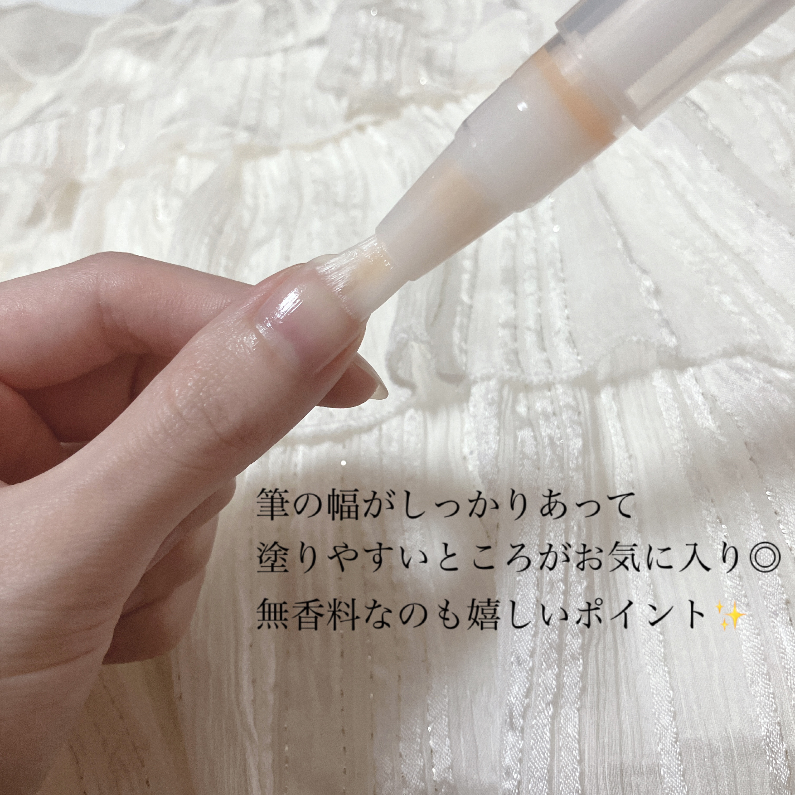- 植物性オイル配合で爪にうるおいを与え乾燥からまもります。肌なじみがよく指先のマッサージにもお使い頂けます。指先にも使いやすいペン型容器です。 植物性うるおい成分として、カミツレ花エキス、ホホバ種子油、シア脂、アンズ核油と保湿成分としてヒアルロン酸Naを配合しました。ネイルカラーの上に重ねて使用される場合には、ネイルカラーが完全に乾いたことを確認してからご使用ください。 ・無香料・無鉱物油・パラベンフリー・アルコールフリー