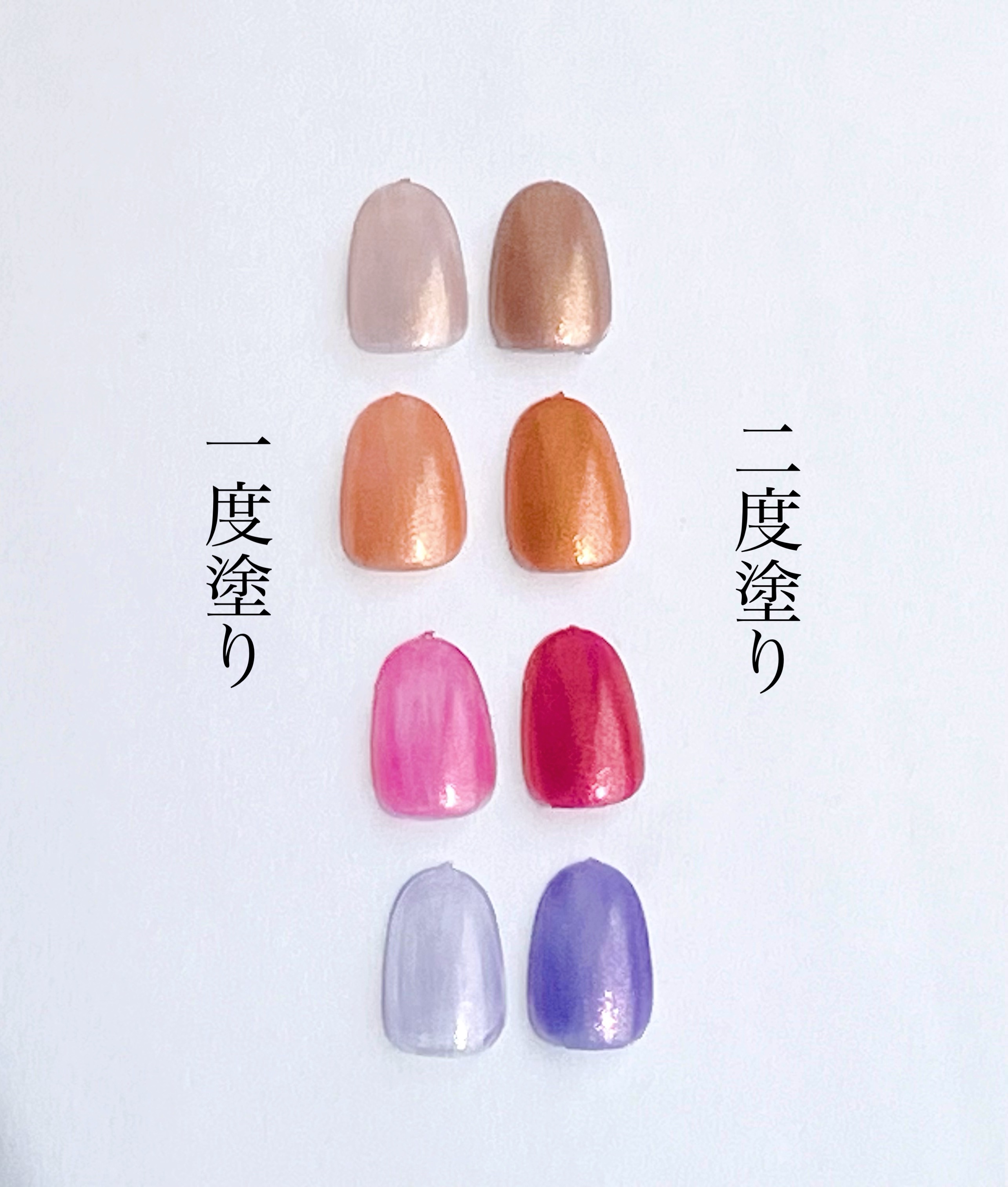 可愛いピンクゴールドみたいな色なんだけど、写真ではちょっと再現出来ませんでした💦 THE夏!って感じのエネルギッシュなオレンジ🧡 気分が上がるすごく鮮やかなピンク🩷 1度塗りの透け感可愛いまさに青みパープル💜