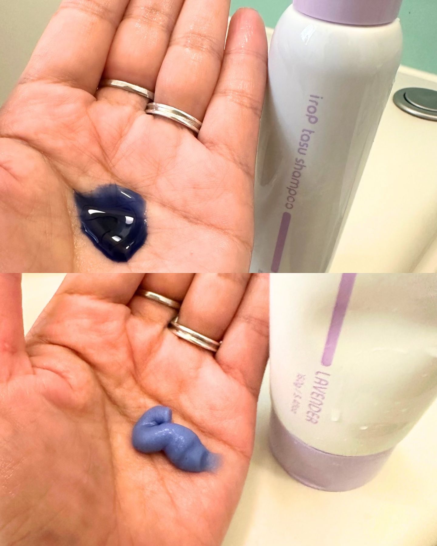 カラーシャンプーは青色で、水を含ませてよく泡立ててて髪を洗ってくよ! トリートメントも色は紫っぽいブルーでこちらも揉み込みながら馴染ませていくと色の入りがいいかも。 トリートメントも、こっくりな感じだけど 馴染みやすく洗い上がりはつるんって感じ