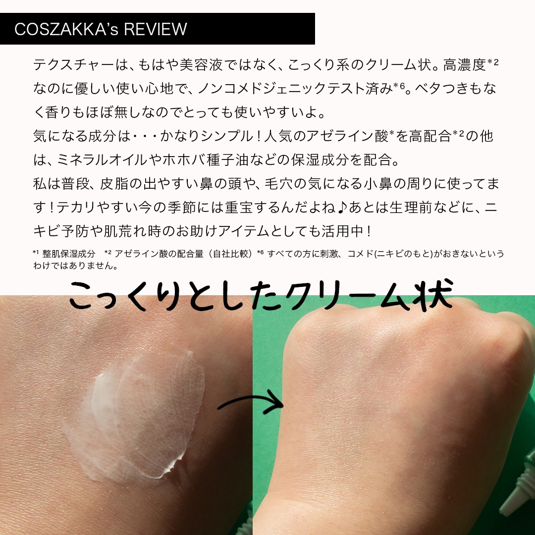 - <本体> 水、アゼライン酸、BG、トリエチルヘキサノイン、ミネラルオイル、トリ(カプリル酸/カプリン酸) グリセリル、ジグリセリン、ペンチレングリコール、ステアリン酸グリセリル、ホホバ種子油、PEG-60水添ヒマシ油、EDTA-2Na、ナイロン-12、セタノール、(アクリロイルジメチルタウリンアンモニウム/VP) コポリマー、ステアロキシヒドロキシプロピルメチルセルロース