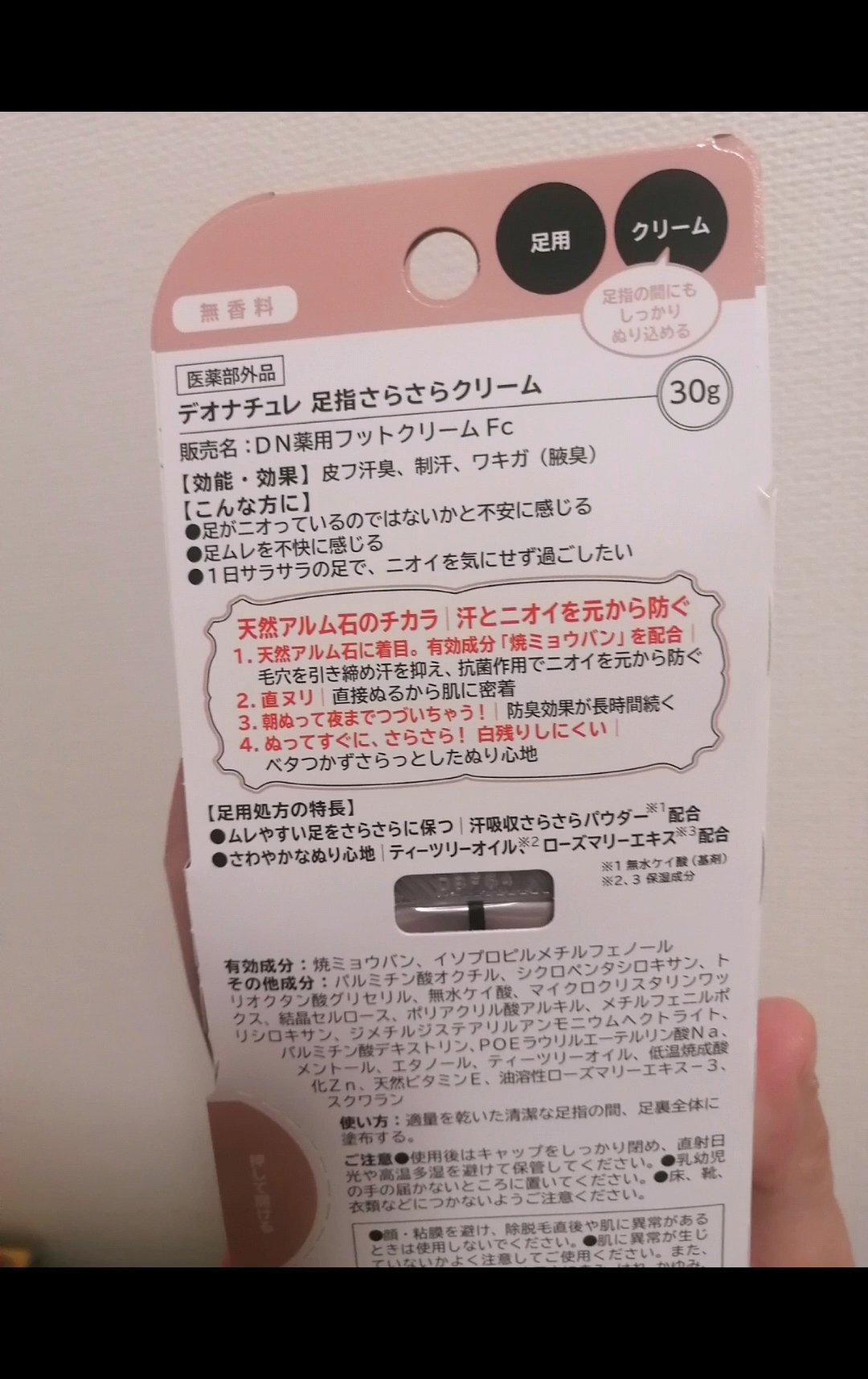 - \11年間ず~っと売上No.1*直ヌリ制汗デオドラントブランド/ 『防臭力のデオナチュレ』シリーズから、足特有のムレ・ニオイを防ぐ足用処方「薬用デオナチュレ足指さらさらクリーム」 ◆◆靴、脱ぐの⁈とドキッとすること、ありませんか?◆◆ 足は1日コップ約1杯分の汗をかき、ムレて、ニオイやすい だから、デオナチュレの足用でケア! ◆◆ユーザーから選ばれる理由◆◆ 1.天然アルム石に着目。有効成分「焼ミョウバン」を配合し、汗・ニオイを元から防ぐ! 足汗吸収さらさらパウダー**やティーツリーハーブ・ローズマリーエキス***を配合 2.ニオイの発生源に“直ヌリ”で、朝ぬって夜まで続いちゃう! 3.クリームなのに、ベタつかず・白残りしにくい ==注意== ●顔・粘膜を避け、除脱毛直後や肌に異常があるときは使用しないでください。●肌に異常が生じていないかよく注意してご使用ください。また、お肌に合わないとき、使用中に赤み、はれ、かゆみ、刺激、色抜け(白班等)や黒ずみ等の異常があらわれたときは、使用を中止し、皮フ科専門医などにご相談ください。●使用後はキャップをしっかり閉め、直射日光や高温多湿を避けて保管してください。●乳幼児の手の届かないところに置いてください。●床、靴、衣類などにつかないようご注意ください。 販売名:DN薬用フットクリームFc *インテージSRI+直ヌリ制汗剤市場(形状:ロールオン・スティック・クリーム・ジェル・パウダー) 2013年5月~2024年4月 デオナチュレシリーズ 累計販売金額 **基剤:無水ケイ酸 ***保湿成分