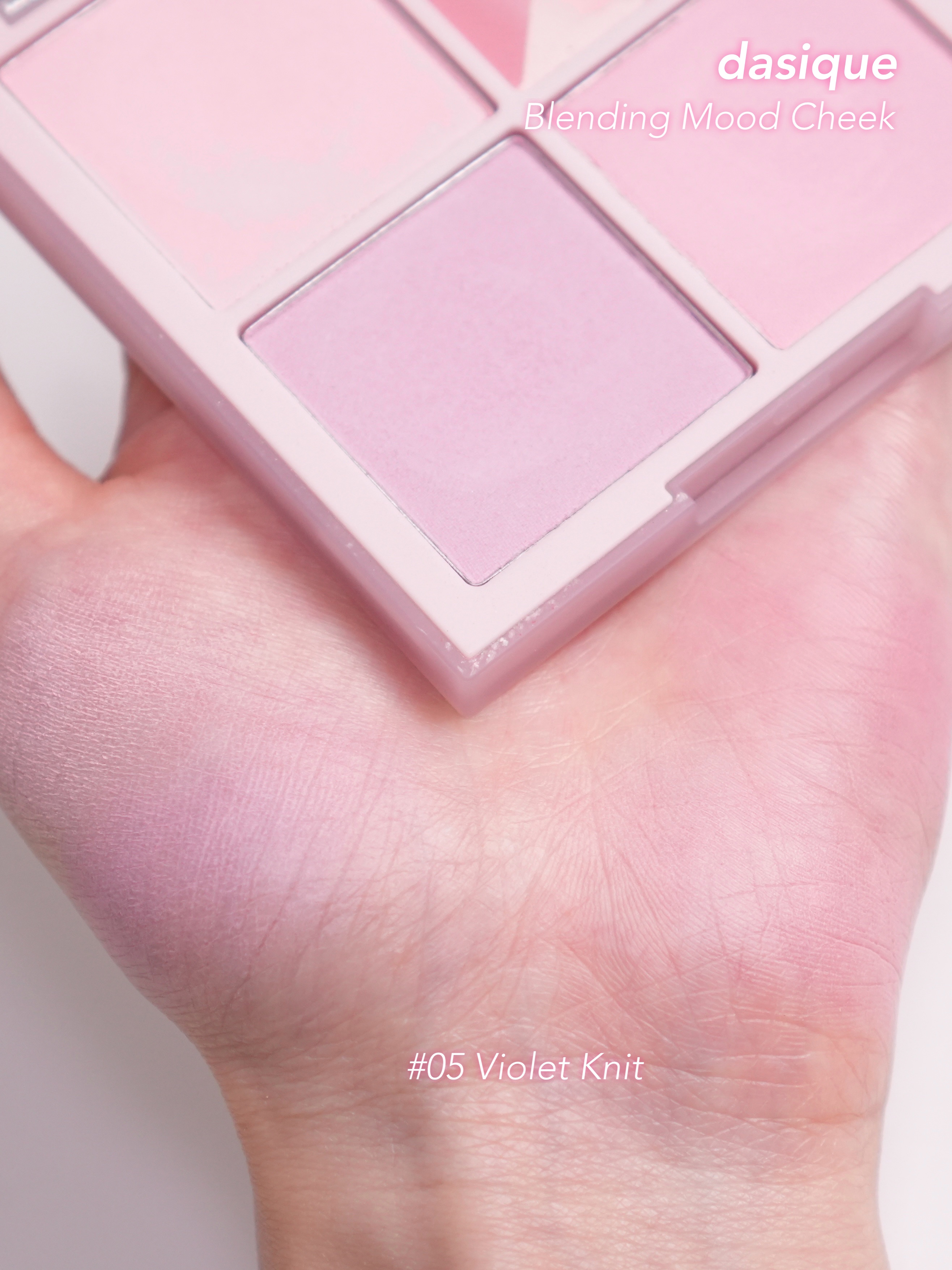 dasiqueのブレンディングムードチーク 05バイオレッドニットを購入しました。 こちらは4色パレットのチークです。色味はくすみピンク、赤みのあるピンク、パープル系、青みよりのピンクと全体的にブルベの方におすすめです。 粉質はサラサラしていてふんわり色づいて落ちにくいです。