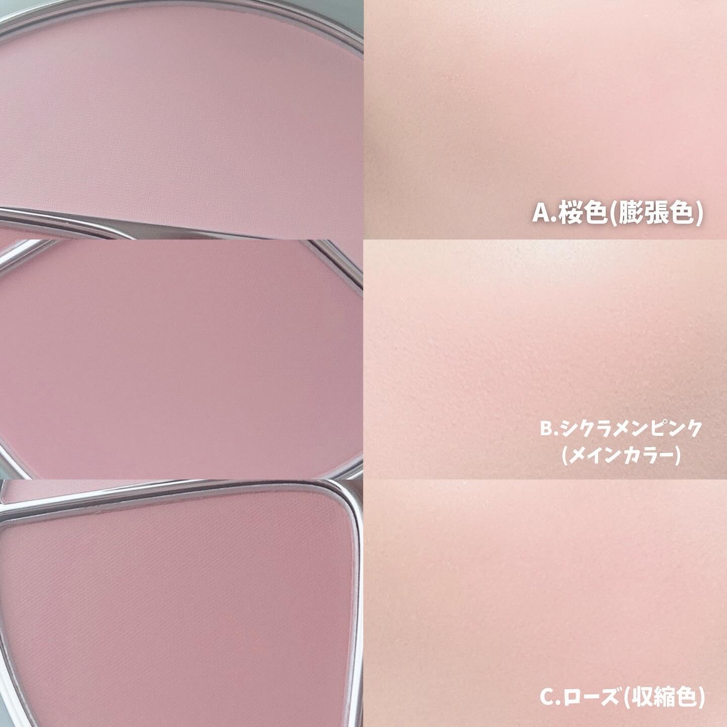 - 「膨張色+メインカラー+収縮色」の三色一体型チークパレット。 異なる明度と彩度の色で自然なグラデーションと立体感を作ることが可能。単色で使用すれば様々な雰囲気のメイクが楽しめ、違う色を重ねて使用すると、三色が程よいバランスで雰囲気と立体感を作り出す。