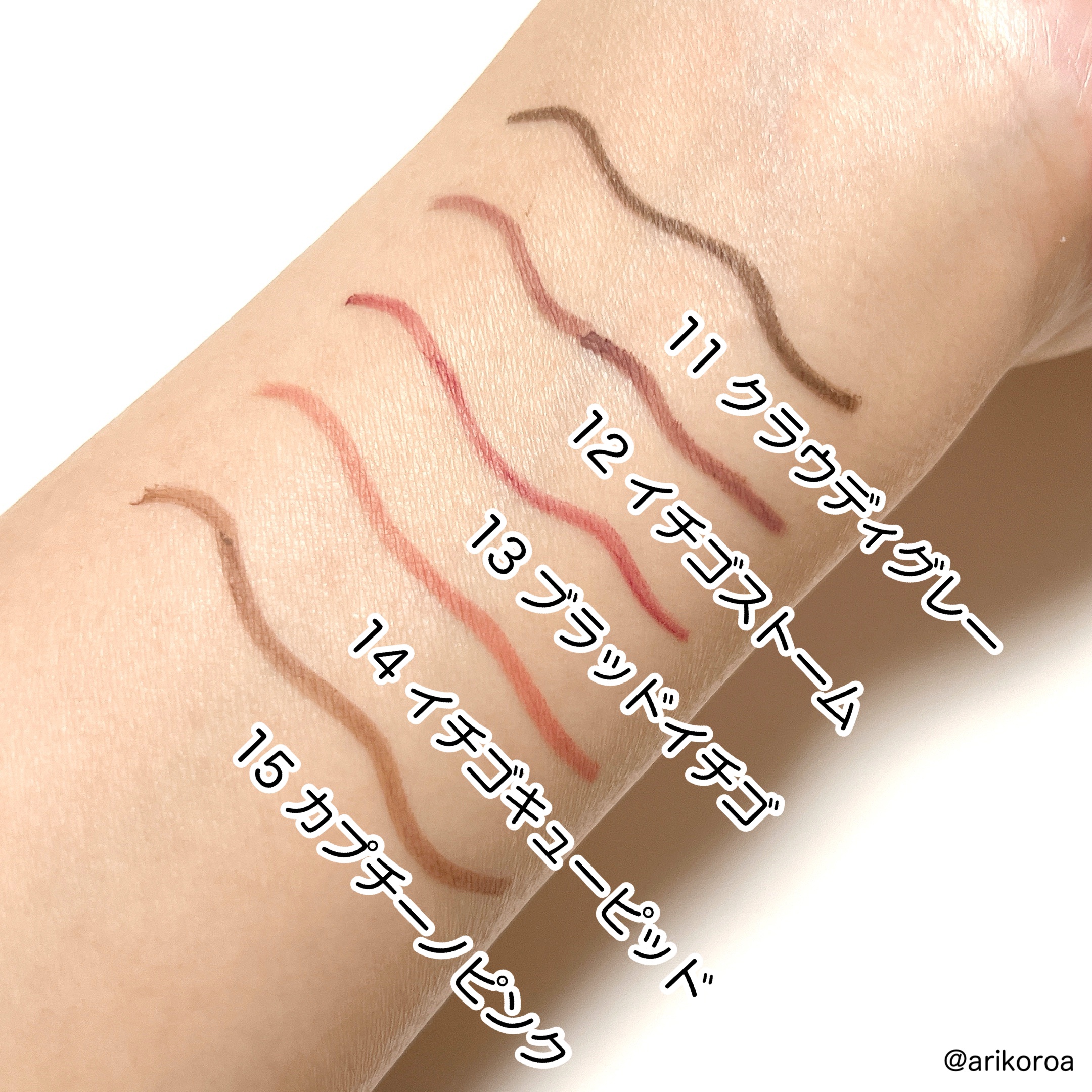 09 ダージリンピンク ピンクと名前が付いているけど スウォッチの印象は明るめオレンジブラウン。 11 クラウディーグレー 今回の5色の中だと1番濃いめのカラー。 12 イチゴストーム(限定) 他ではあまり見ない絶妙カラーで ラベンダーベージュといったイメージ。 14 イチゴキューピッド(限定) これぞ粘膜色!というような ピンクベージュ。 15 カプチーノピンク 期待を裏切らなかった可愛すぎる新色… 一言で言うなら白みピンクブラウン。