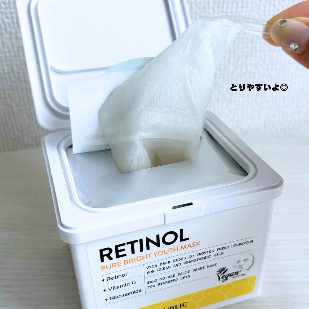 レチノール*をメイン成分とし、9種類のビタミン(*1)を配合した「レチノール* ピュアブライトユースシートマスク」。 マイルドでさっぱりした使い心地がまだまだ蒸し暑いこの季節にぴったり! 薄いシートで密着してくれる感じでとても好きな感じ◎
