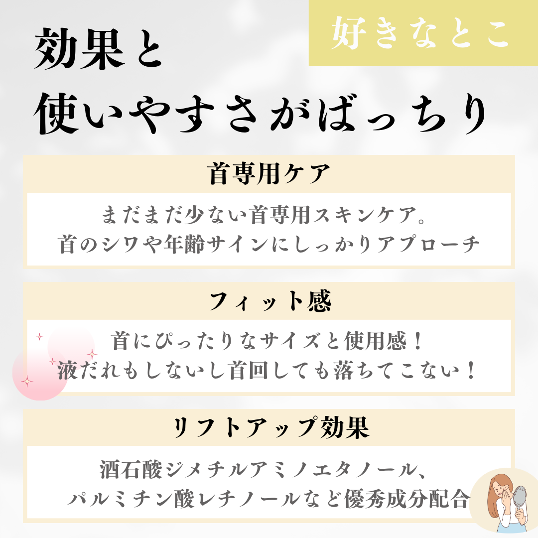 - 紀州備⻑炭繊維シートを使⽤したネックケアマスク。 首元のハリが気になる方・首元をなめらかにケアしたい方・エイジングケア*したい方を訴求ターゲットにした⾸元⽤のネックケアマスク。 ハリケアが期待できる酒⽯酸ジメチルアミノエタノール、整肌ケアが期待できるパルミチン酸レチノール、弾力ケアが期待できるグリコシナルリンギン配合。 こだわりのネックケアマスクでキレイな⾸元に。 *年齢に応じたお手入れ