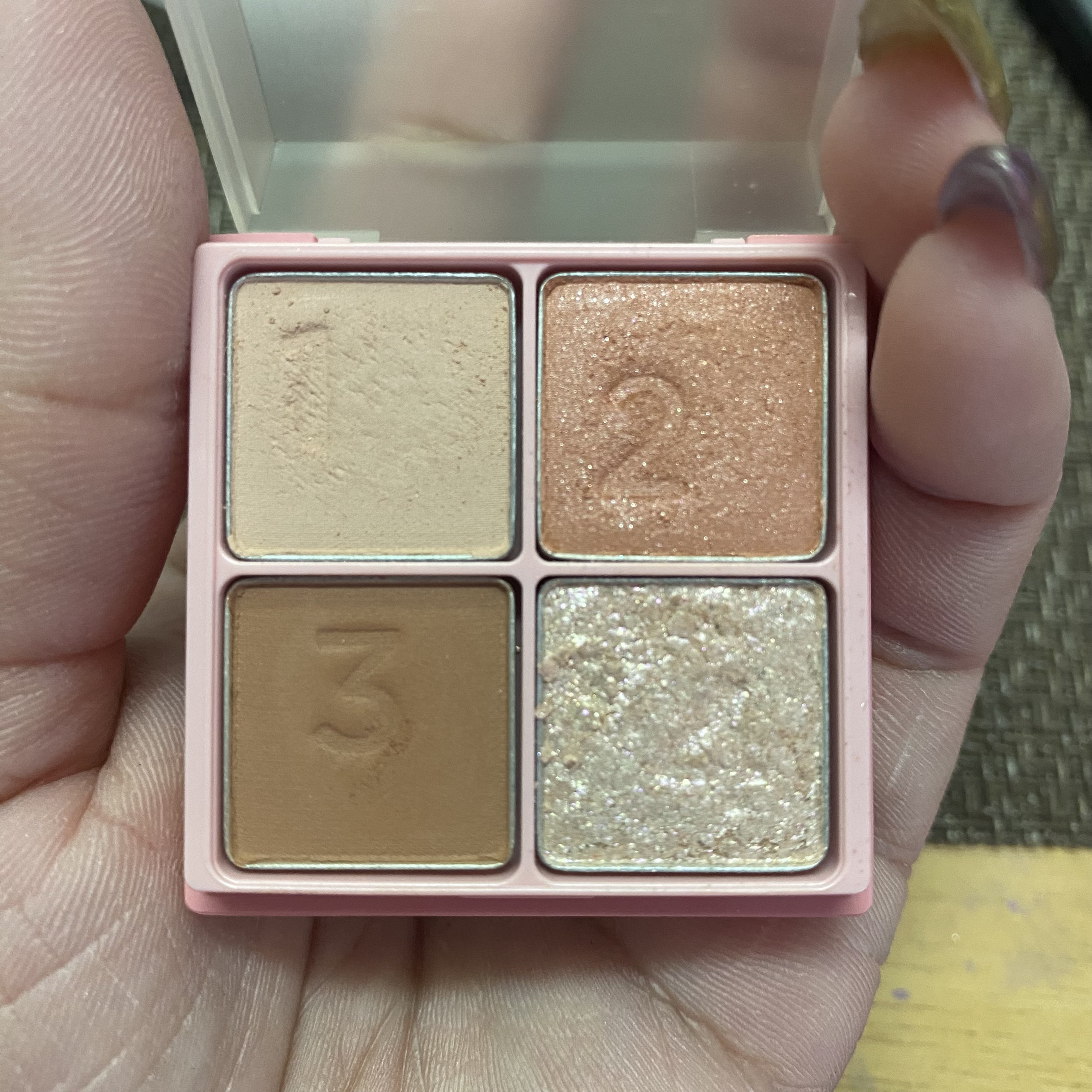 CANMAKEベルベッティフィットカラーズ01チョコレートティラミス02ハニーダイヤモンド03ベビーアプリコット04ローズココアセルレにて4つセットで490円と激安で購入💓1個の金額にも満たしてないこの安さに驚愕wアイシャドウラブな私からした...