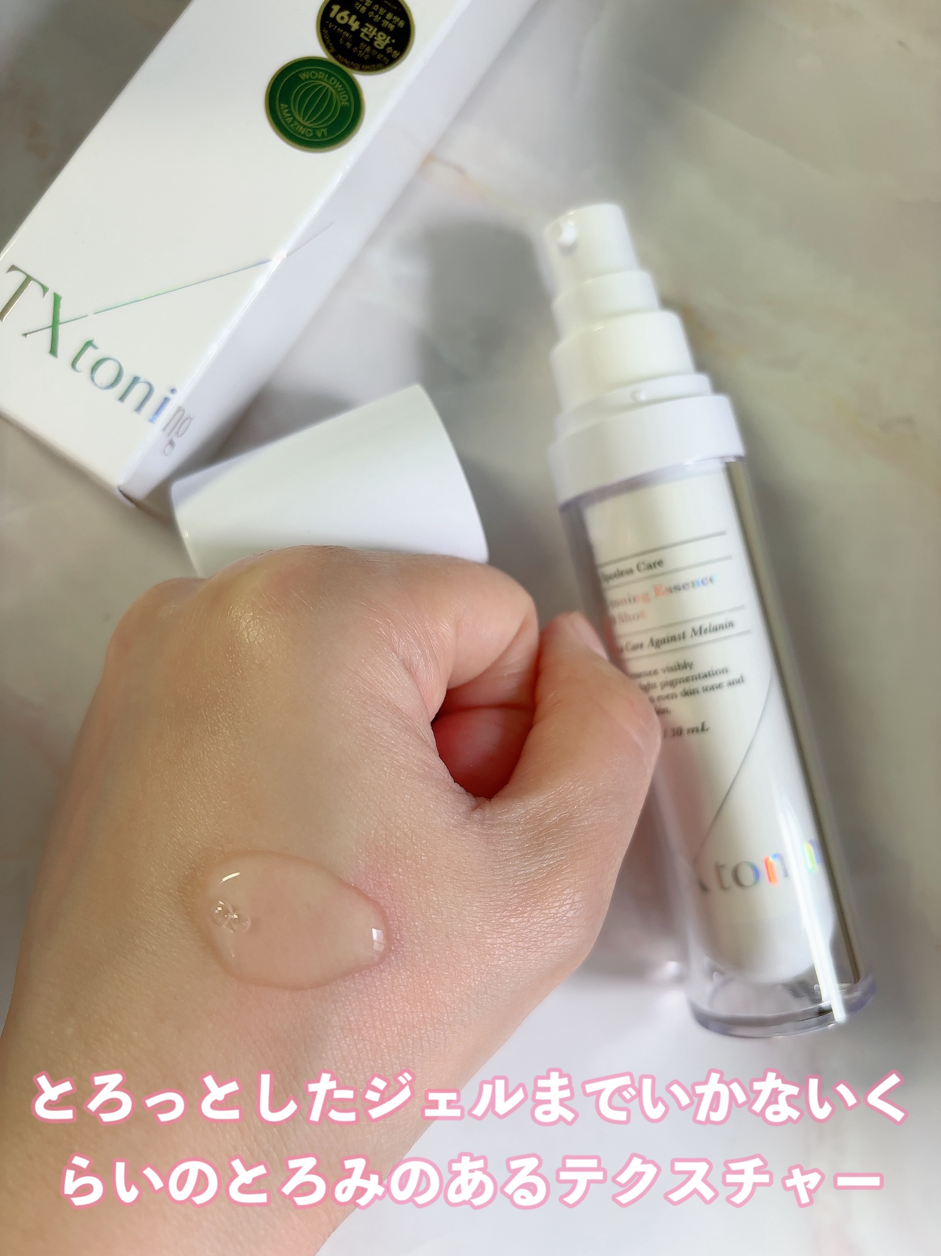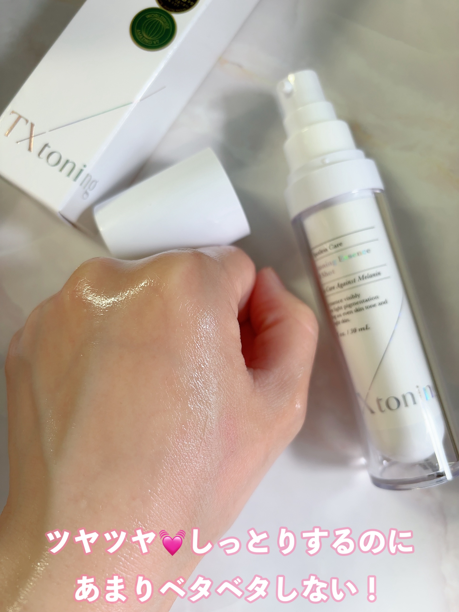 - <TXトーニングエッセンス1000SHOT> 水、グリセリン、トラネキサム酸、ナイアシンアミド、1,2-ヘキサンジオール、アラントイン、キサンタンガム、(アクリレーツ/アクリル酸アルキル(C10-30))クロスポリマー、カルボマー、エチルヘキシルグリセリン、グリチルリチン酸二カリウム、アデノシン、EDTA-2Na、ヒアルロン酸Na、水添レシチン、マカデミア種子油、スクワラン、グルタチオン、グリチルリチン酸、セラミドNP、ステアリン酸、コレステロール、加水分解ヒアルロン酸