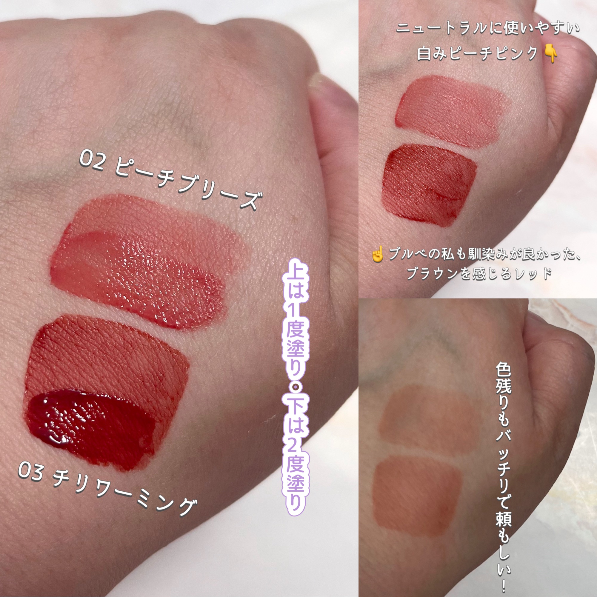 シャドウパレット 27番ローズミルクティー 上段のほうは白みがあり、青みも感じる。下段の方にいくにつれ、だんだんくすみが強めに出てきて、青みは少し弱くなってくる感じ。 白桃ウーロン系メイクが好きな方に推したい!ラメが入っているものは2色で、どちらもチラチラとした微細なラメ。 ジューシーデュイティント 25アールグレイローズ 25は、公式の唇の画像より青みがありました。ブルベ夏、イエベ秋の方が得意そう。