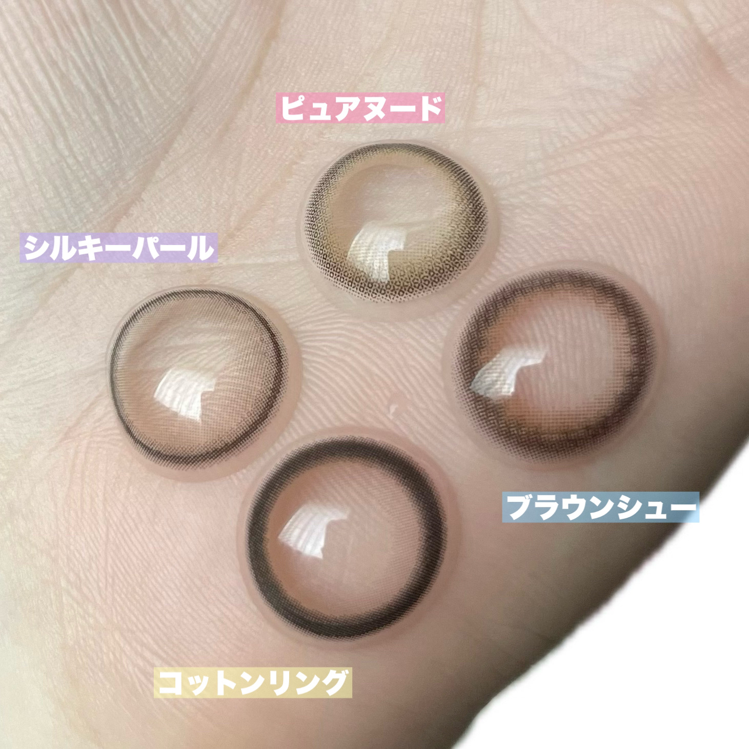 - ※2025年6月以降、商品パッケージ裏面・側面の一部表記を順次変更いたします。尚、これにかかる商品の交換・返品は承っておりません。 ふわっと漂う多幸感 キラキラとした瞳 そんな多くの人が憧れる印象はmelloewで作れる! 王道盛れからあざと盛れまでどんな盛れも叶うラインナップで瞳をコーディネート☆ Cotton Ring(コットンリング) DIA14.2㎜/着色直径13.5㎜ 溶け込みベージュ×くっきりフチ 写真でもリアルでも盛れちゃう♪ Silky Pearl(シルキーパール) DIA14.2㎜/着色直径13.5㎜ ツヤっぽベージュ×細フチ 垢抜けた印象にしたい方におすすめ♪ Truffle Gray(トリュフグレー) DIA14.2㎜/着色直径13.4㎜ おしゃれモテ♡ 濃いめグレージュ×ぼかし細フチ 品よく盛れるお嬢様な瞳に Pure Nude(ピュアヌード) DIA14.2㎜/着色直径13.2㎜ 絶妙ヌーディカラー×グラデフチ お仕事やカラコン初心者にもおすすめ♪ Brown Chou(ブラウンシュー) DIA14.2㎜/着色直径13.6㎜ まろやかブラウン×ぼかしフチ 日常使いにもおすすめ♪ Mocha Powder(モカパウダー) DIA14.2㎜/着色直径13.6㎜ リピ確モテ♡ ふわふわモカ×くりっとフチ 絶対盛れちゃう甘い瞳に Love Cacao(ラブカカオ) DIA14.2㎜/着色直径13.0㎜ 清楚モテ♡ とろふわチョコレート×こっそりフチ バレずに盛れちゃう瞳に カラーコンタクトレンズの不適正使用による眼障害の危険性等などがあります。 ●コンタクトレンズは高度管理医療機器です。不十分な洗浄・消毒など不適切なケアや、長時間・交換期間を超えた装用により、アレルギー性結膜炎、角膜感染症、角膜潰瘍等の重篤な眼障害が発生する危険性があります ●ご使用前に取扱説明書を確認してください 使用上の留意事項 ●眼科医院等を受診してからお求めください ●眼に異常を感じたら直ちにレンズ使用を中止し、お近くの眼科等で診察を受けてください ●医師の指示にしたがってご使用ください ●コンタクトレンズを装用する場合、自覚症状がなくても、眼科医院等での定期検査を受けてください ●レンズに不具合がある場合は使用しないでください