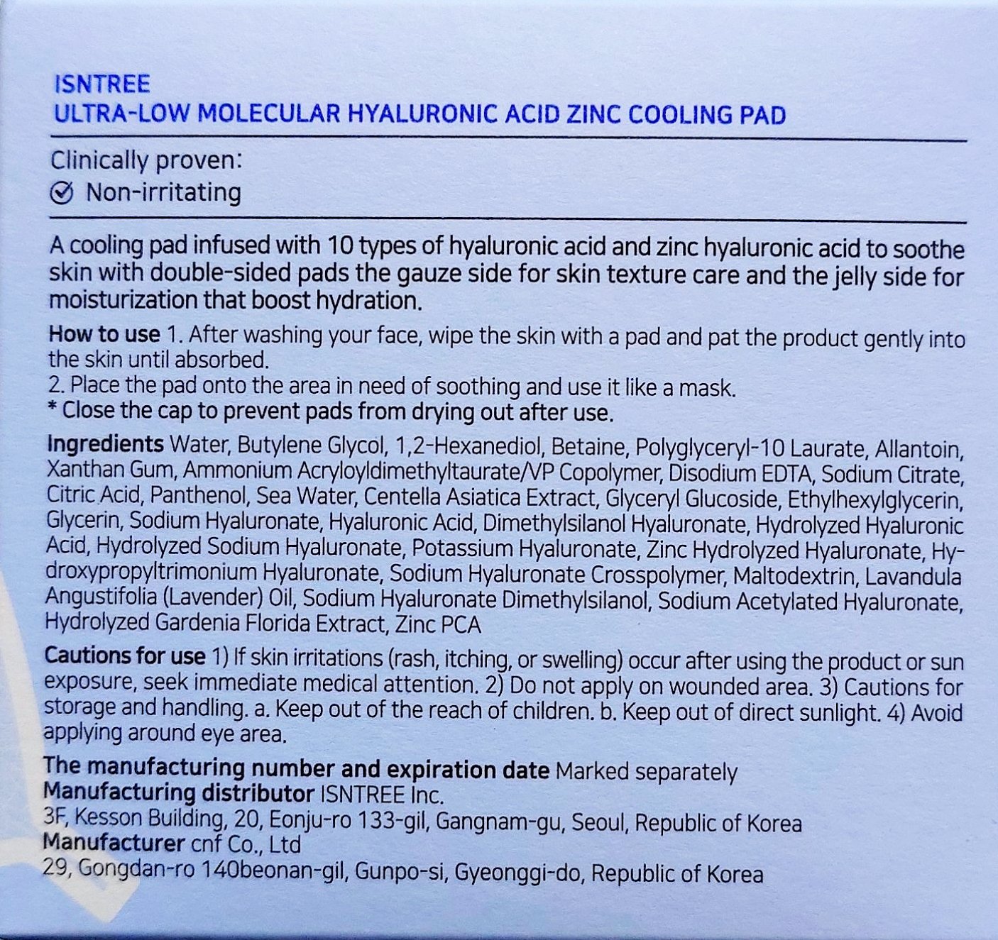 Isntree 超低分子ヒアルロン酸ジンククーリングパッド |