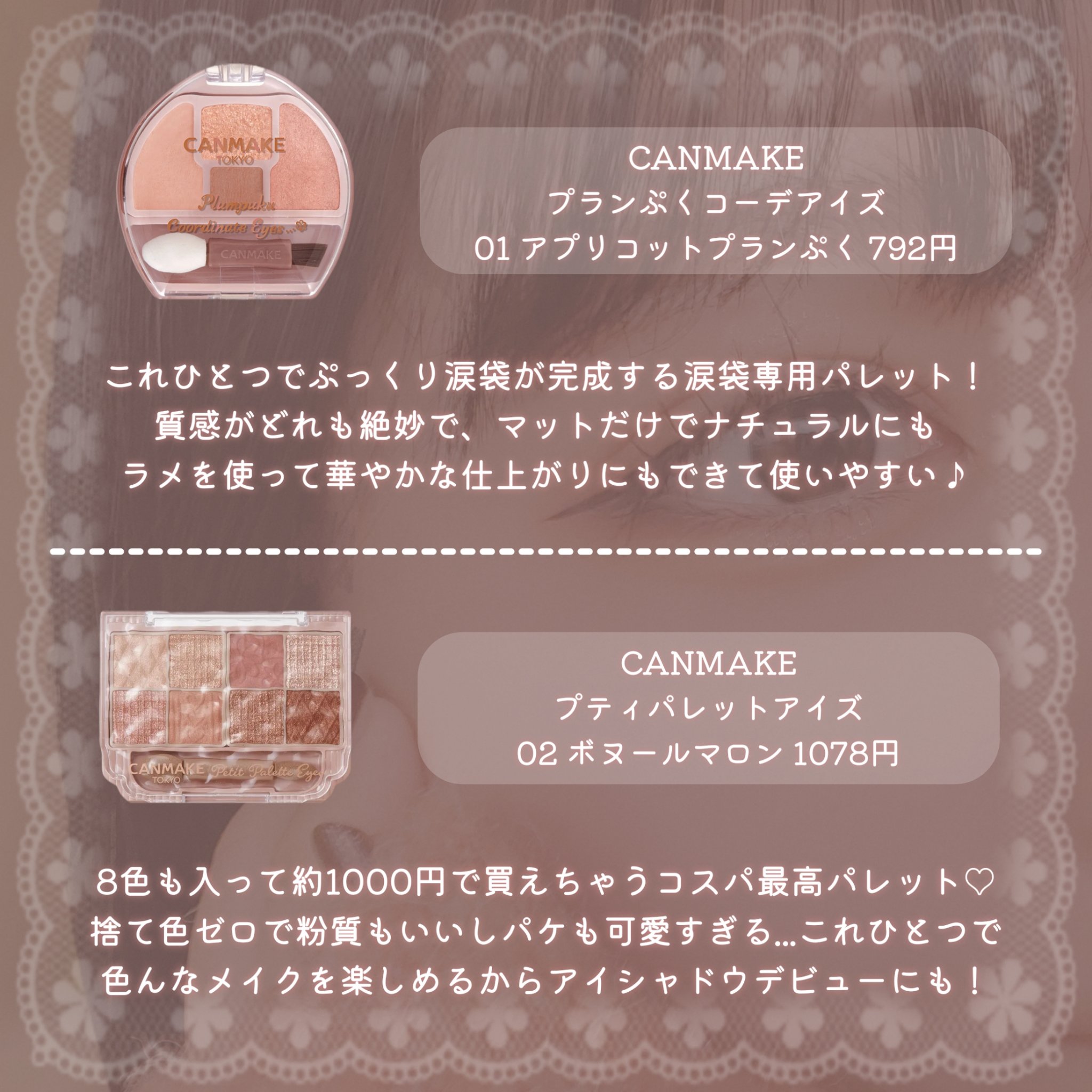 アイシャドウはCANMAKEから2つ🧸 どちらも1つでぷっくり涙袋が完成する♪ 個人的にはチャコット推し!色味も太さも ちょうど良くて一気に涙袋爆誕する🥹 高い...!って人はキャンメイク使ってみて!! イエベ民はゴージャス姉妹買うべき!!!! グリッターはセザンヌしか買ったことない から比較のしようがないけど普通に良い👍