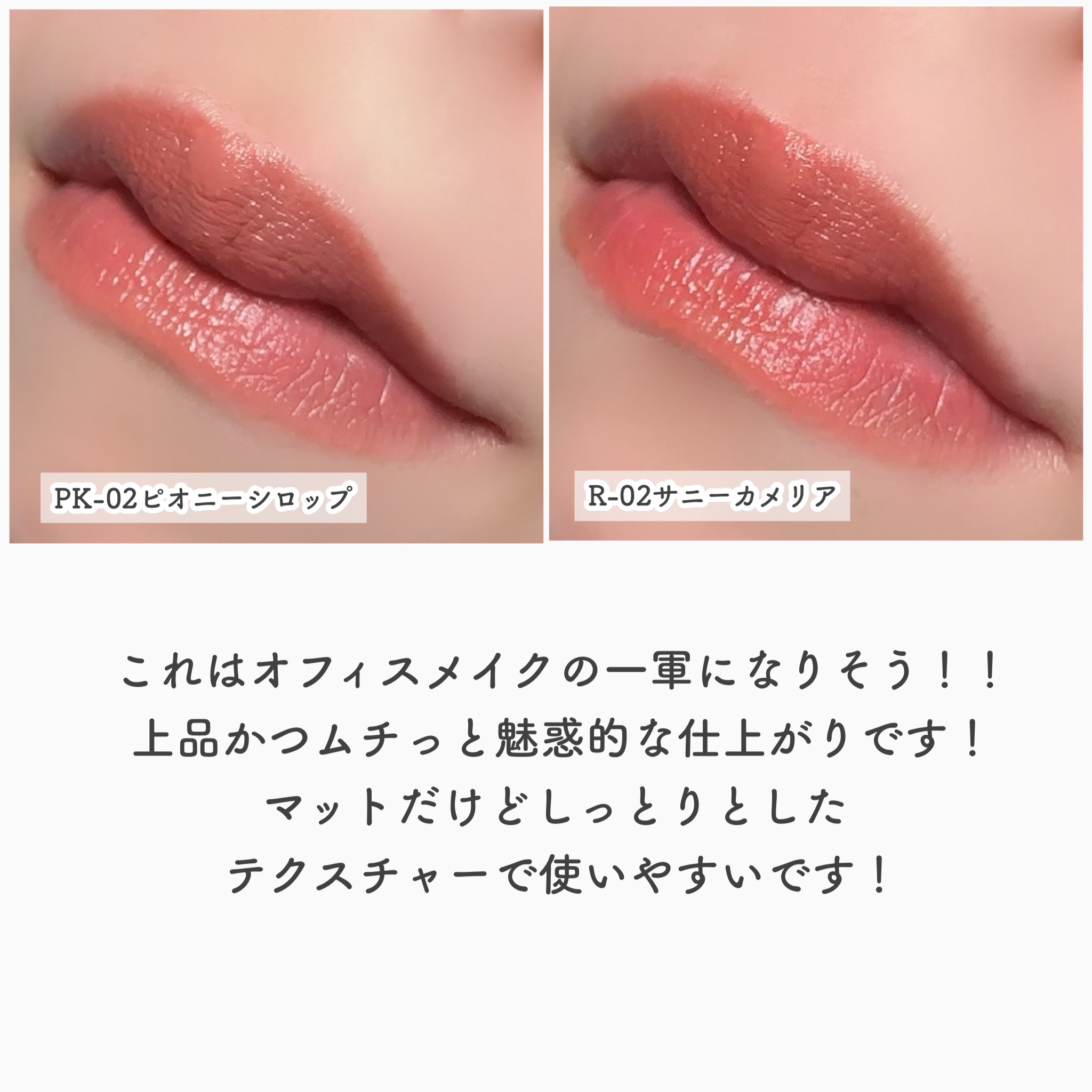- センシュアルを引き出す、湿度をまとったマットリップスティック。 とろけるようなリップベースと球状パウダー*1がなめらかな塗り心地を実現し、ソフトフォーカス効果で縦ジワを補正します。 板状パウダー*2が唇にピタっと密着!落ちにくく、つけたての高発色を長時間キープします。 美容エモリエント成分配合でつけている間中、唇をトリートメントし、乾燥を防ぎます。 マットなつけ心地なのにうるおいを感じる使用感です。 *1:シリカ、ポリメチルシルセスキオキサン、アルミナ(粉体基剤) *2:硫酸Ba、ジメチコン、水酸化Al(粉体基剤)