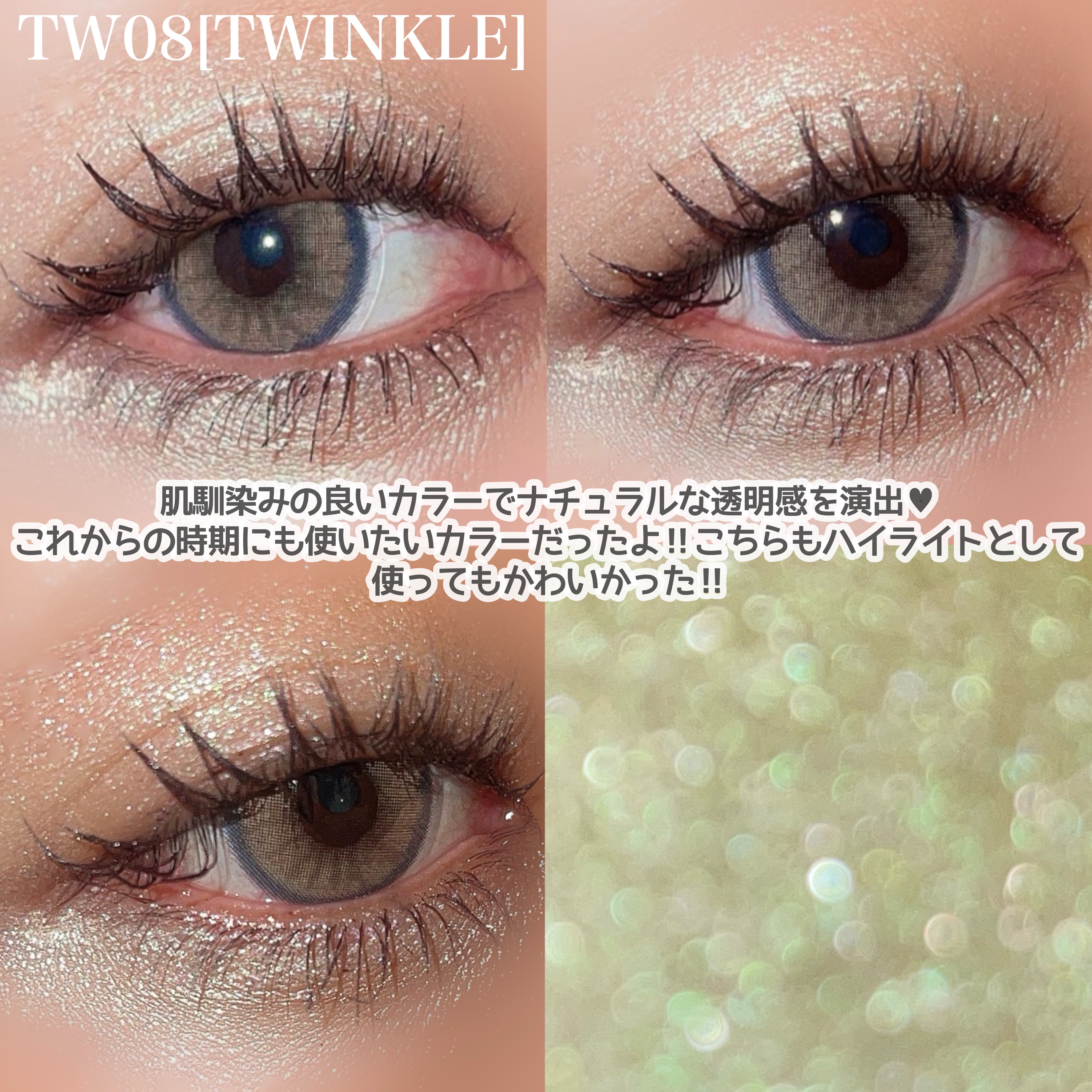 - 9つの質感に秘められた無限の可能性を持つカラーバリエーション。 【トゥインクル】 まるでヴェールのように、極小の光の粒がまぶたを包み込み、上品な華やかさをプラスしてくれるトゥインクル。 ポイント使いをすれば、自然で上品なツヤ感に。普段のメイクのニュアンスチェンジにも活躍します。